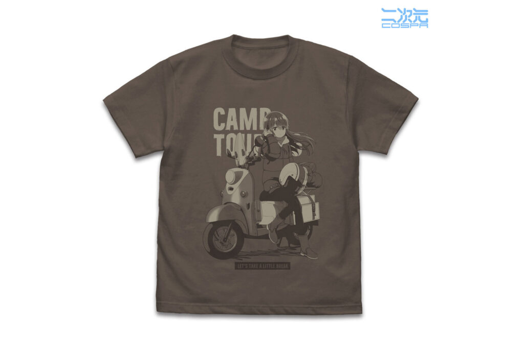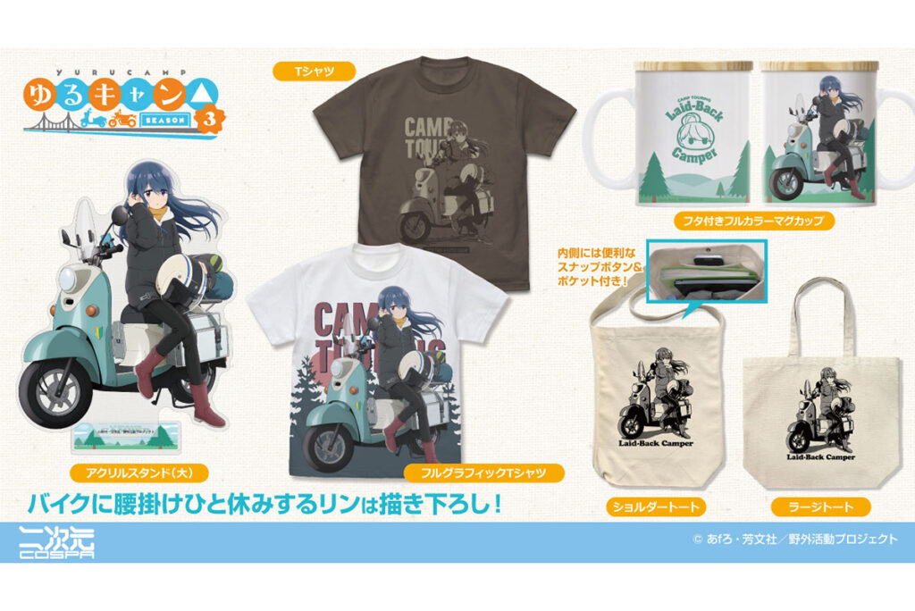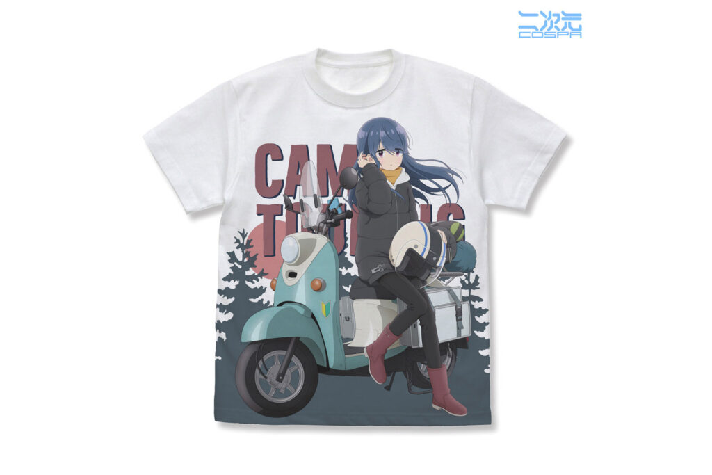 コラボグッズと同時に発表されたのが、TVアニメ『ゆるキャン△ SEASON3』の新規描き下ろしイラストを使用したシリーズです。テーマは「バイクに腰掛けひと休みする志摩リン」。愛車のスクーターに腰を下ろし、旅の途中でリラックスする彼女の表情が、緻密なイラストで表現されています。このイラストを贅沢に使用した「フルグラフィックTシャツ(6,930円)」は、ファンならば一着は持っておきたいインパクト抜群のアイテムです。