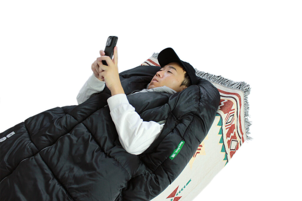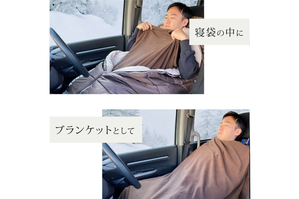 また、センタージップにより車内の狭いスペースでも出入りがスムーズ。さらに、寝袋に入ったまま手を出せるファスナーを装備し、スマホ操作や飲食も体温を逃さず行うことができます。なお、付属のインナーシュラフは、バックルベルトを使うことで「ポンチョ」としても使用可能。避難時の移動中も暖かさをキープできます。