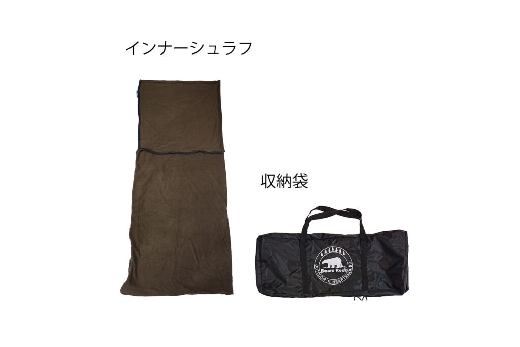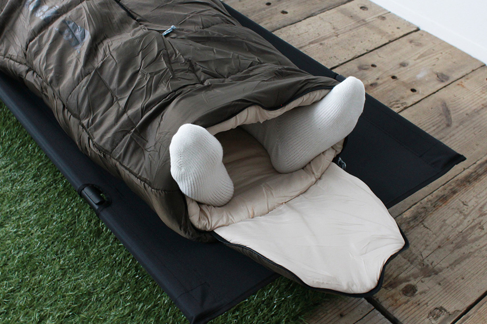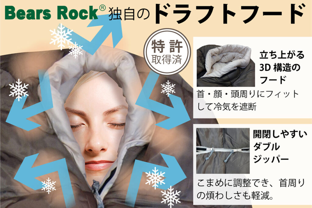 セットの核となるのは、特許取得の「ドラフトフード」を備えたセンタージッパー寝袋です。本製品は徹底した冷気遮断を追求し、首回りにフィットする形状で熱を逃がさず、包み込まれるような暖かさを実現。