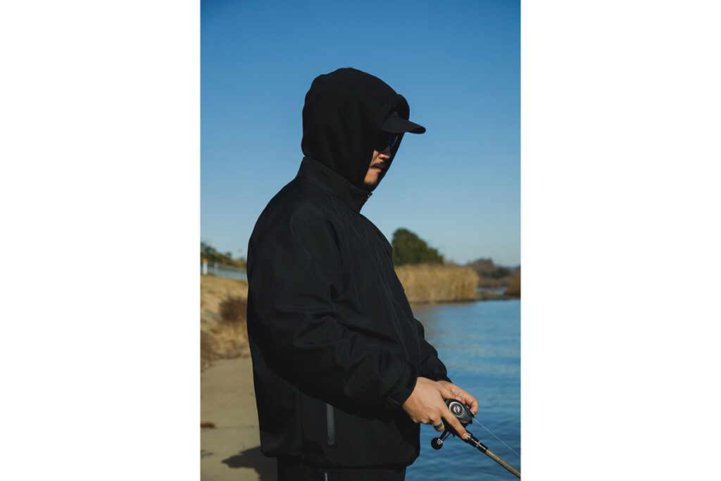「EX WATER REPELLENT ZIP JACKET」は、今回のために一から型を起こした完全オリジナルパターンです。アングラーが冬のインナーとして最も多用するアイテム、それは「フーディ(パーカー)」ではないでしょうか。