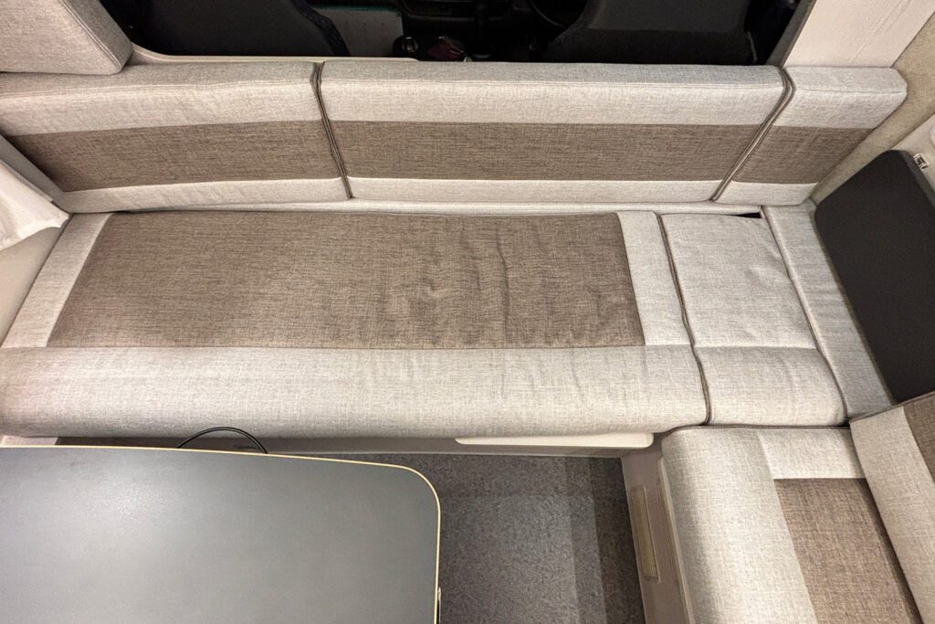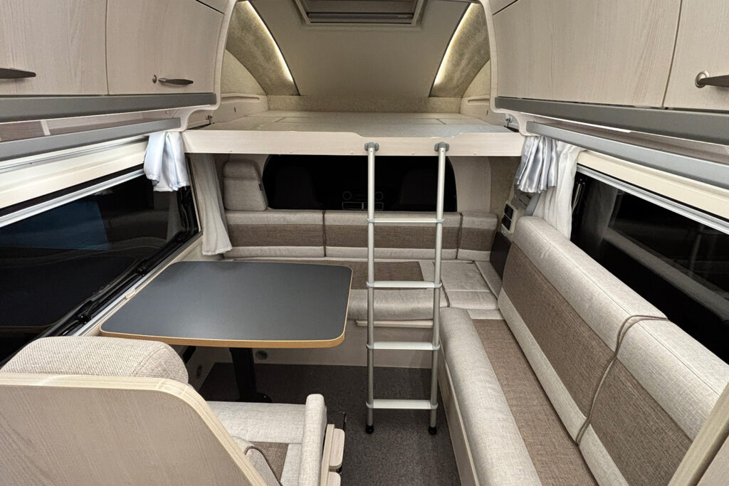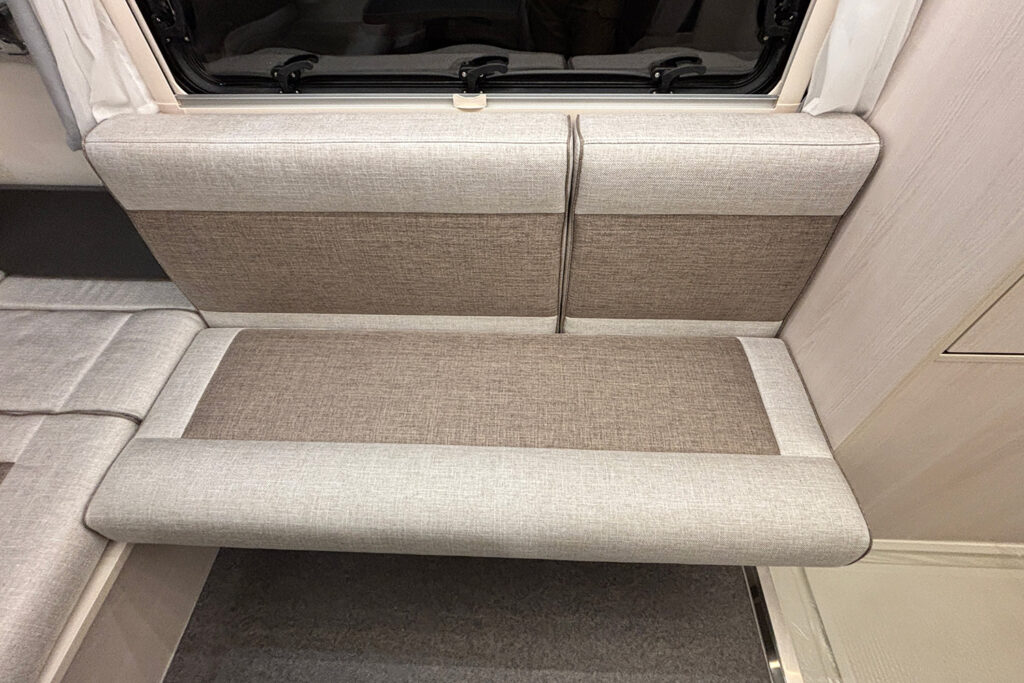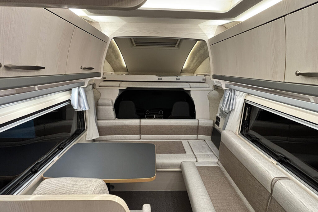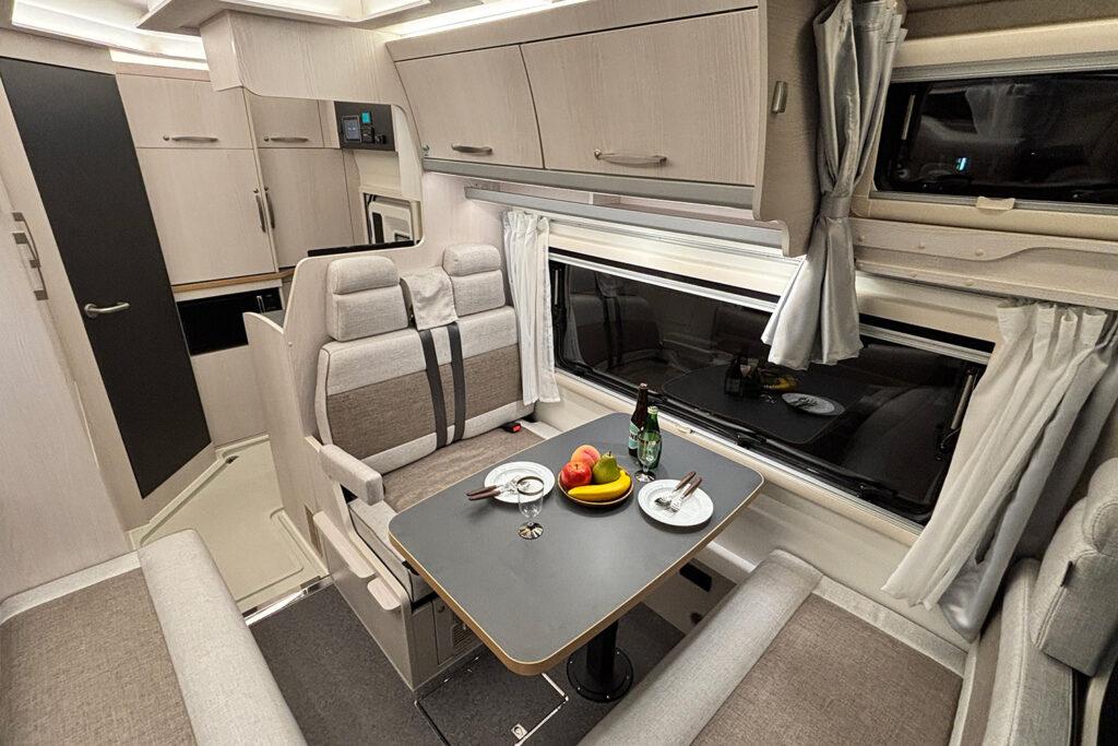 三方向からテーブルを囲める設計いにより、家族や友人が自然に顔を合わせられる居心地の良い空間を演出。また、乗り込んですぐの位置に前向きギャレー(キッチン)を配置したことで、調理と団らんの動線が完全に分離され、車内での移動が劇的にスムーズになりました。