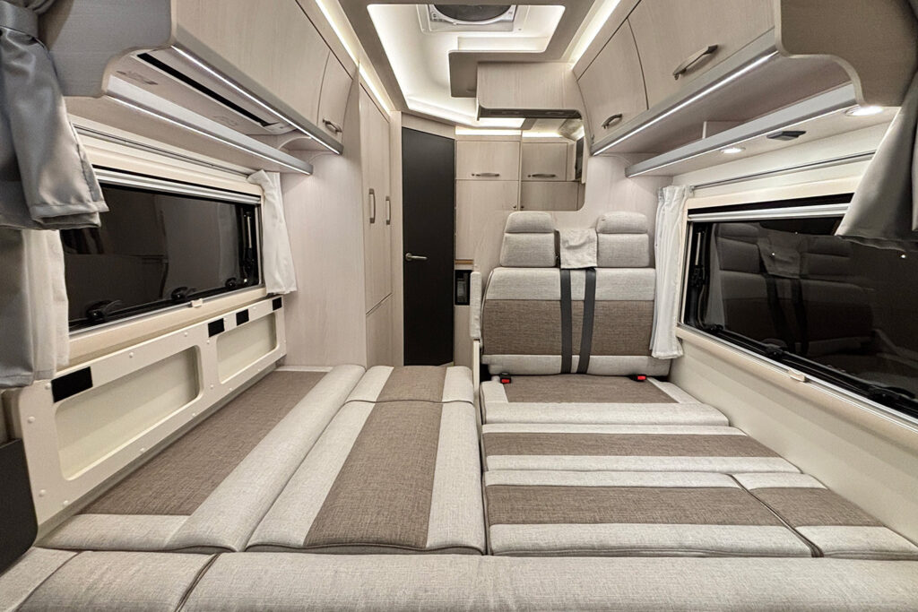 「LIBERTY52REi」最大の変更点は、エントランスを車両後方に配置したレイアウトの採用です。これにより、車内中央に広大な「コの字型ダイネット」が誕生しました。