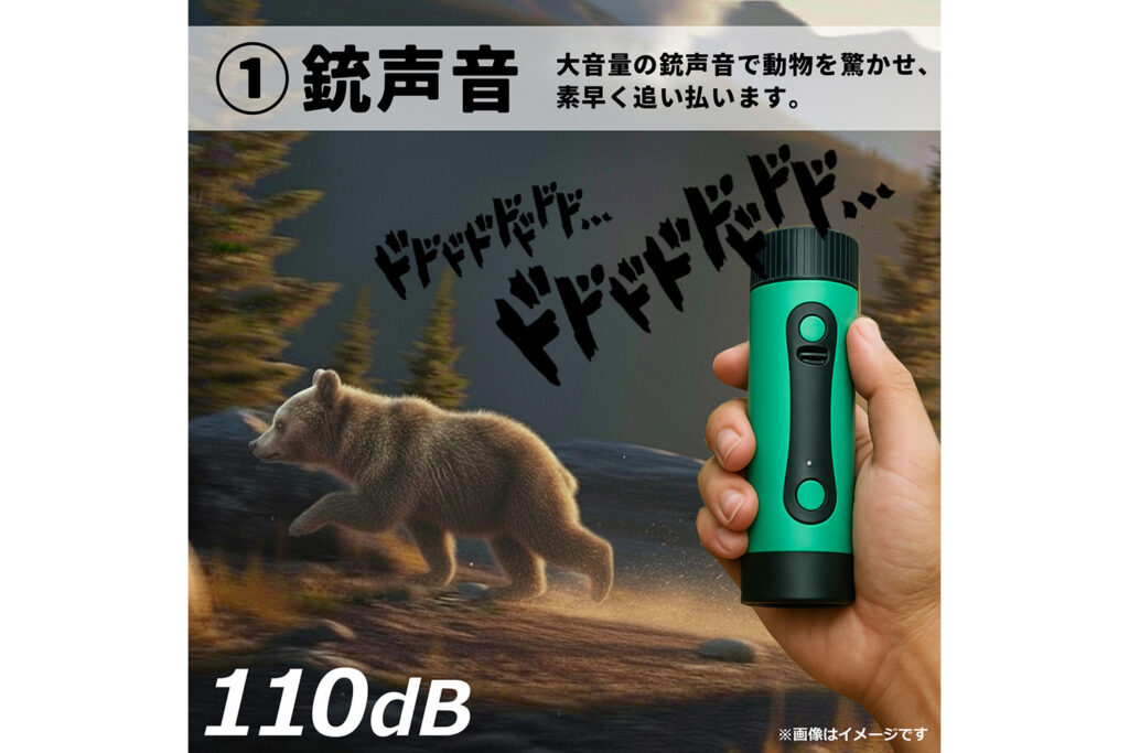 クマなどの大型動物と遭遇してしまった際、最も重要なのは対象を驚かせ、自分から距離を置かせることです。本製品は、ボタン一つで最大110dBという、自動車のクラクションにも匹敵する大音量の「銃声音」を瞬時に発生させます。