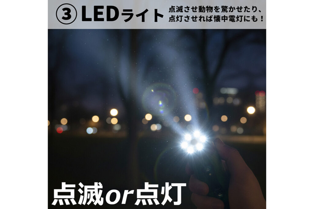 また、銃声音や超音波と連動し、LEDライトが激しく点滅します。視界を遮る強力な光の刺激は、夜間や薄暗い森の中でも高い撃退効果を発揮。聴覚と視覚の両面から、野生動物へ強力に「立ち入り禁止」をアピールします。