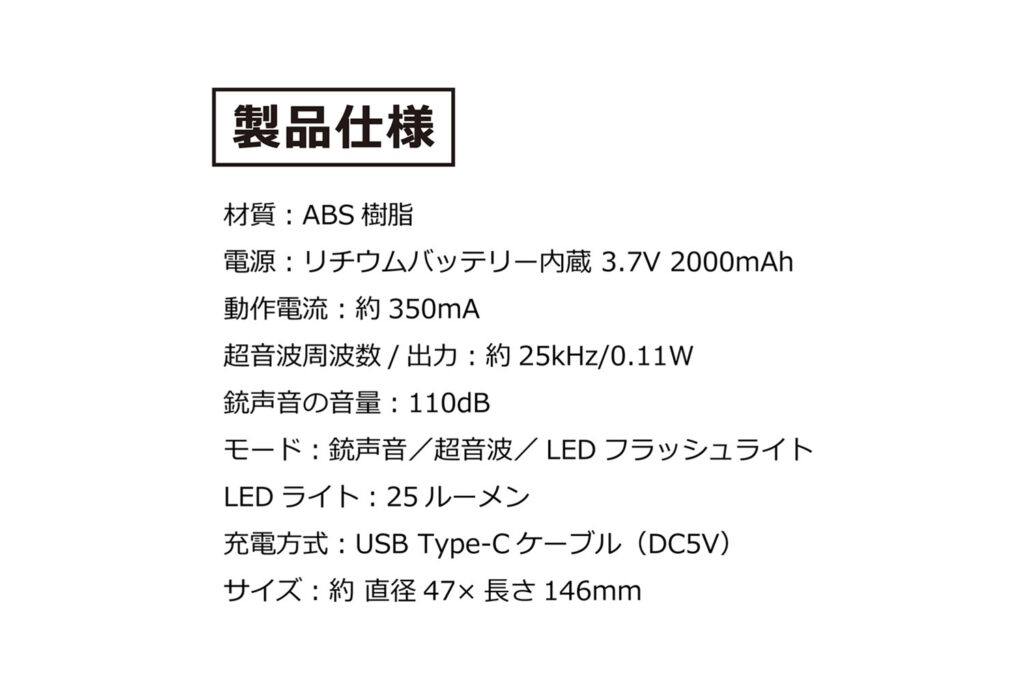 音による威嚇に加え、動物の感覚を刺激するさらなる機能を搭載しています。人間には聞こえにくいものの、野生動物が不快に感じるとされる25kHzの超音波を同時に発信。聴覚からのストレスを与えることで、効果範囲(最大約15m)内からの回避を促します。