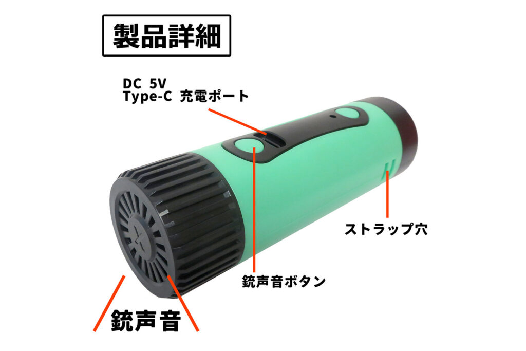 クマなどの大型動物と遭遇してしまった際、最も重要なのは対象を驚かせ、自分から距離を置かせることです。本製品は、ボタン一つで最大110dBという、自動車のクラクションにも匹敵する大音量の「銃声音」を瞬時に発生させます。