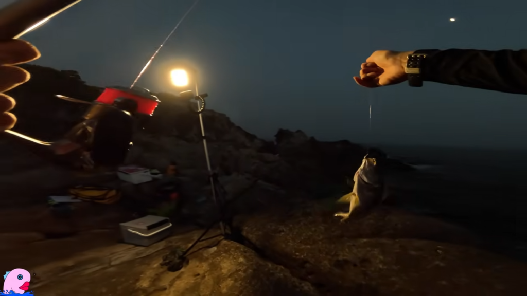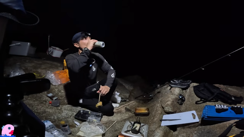 釣ったイサキの処理をする傍らでイサキが爆釣し、大忙し。小さなイサキはリリースし、ついには30cmを超える大きなイサキを釣り上げました。次から次へと釣れる状況に興奮気味のヒデさんからは、夜釣りを満喫している様子が伝わります。夜11時、釣りは一旦終了し、水浴びして夕食を作ることに。