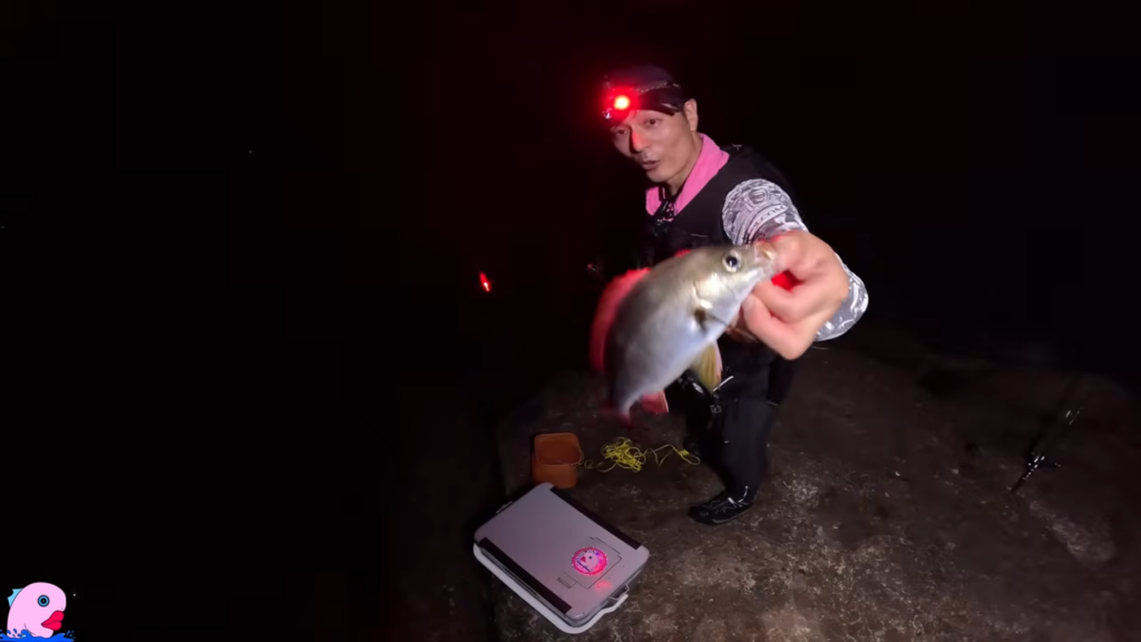 日暮れが近づき、次はイサキを狙ったカゴ釣りをスタートさせます。すっかり日も沈んだ頃、ウキを電気ウキに換え、カゴ釣り・ぶっ込み釣りともに期待が高まる時間帯へ突入です。潮の流れに多少の不安は感じたものの、さっそくイサキをゲット! これにはヒデさんもとても嬉しそうでした。その後しばらくアタリのない時間もありますが、潮が流れ始めると遠投で面白いようにイサキがかかり始めます。