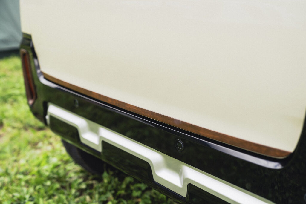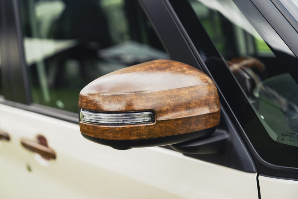 ウッド調に仕上げたパーツは前後のエンブレムに始まり、フォグランプのカバーやドアハンドル、ドアミラーなど結構な点数。リアゲート下のモールは市販のデリカミニ用メッキモールを塗装しています。