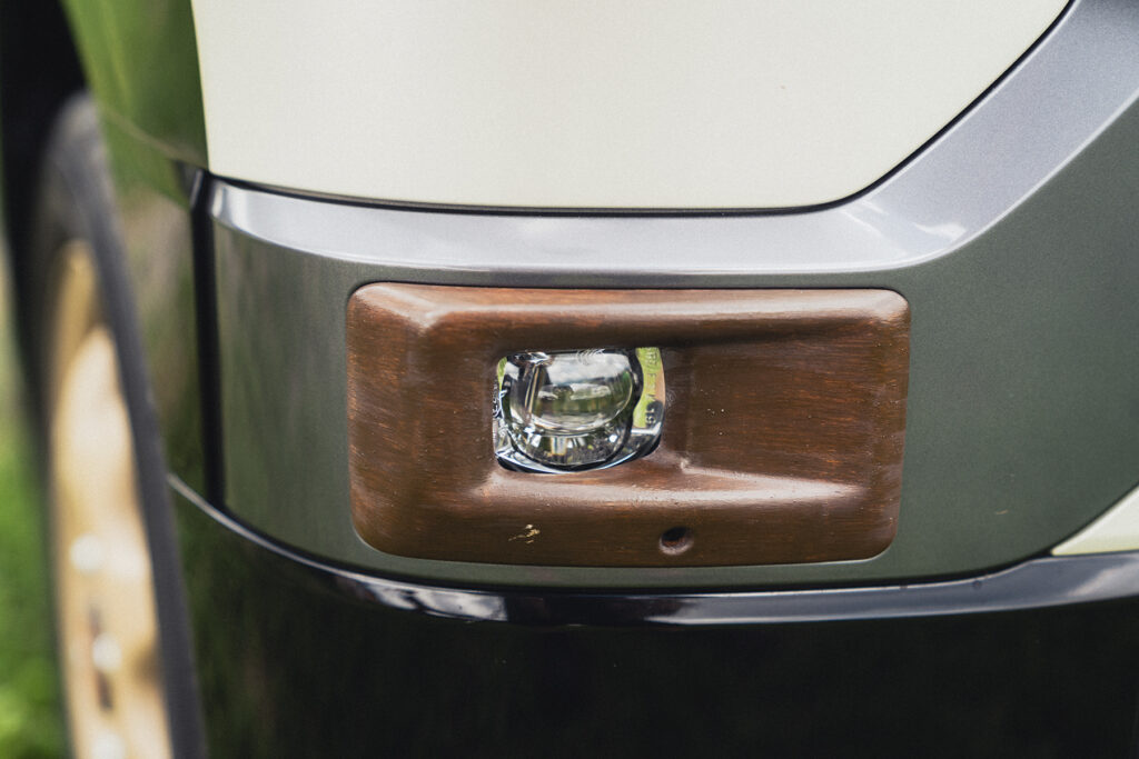フロントバンパーの車名ロゴ部分をウッド塗装した三菱・デリカミニ