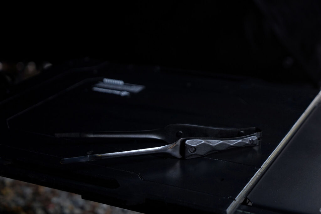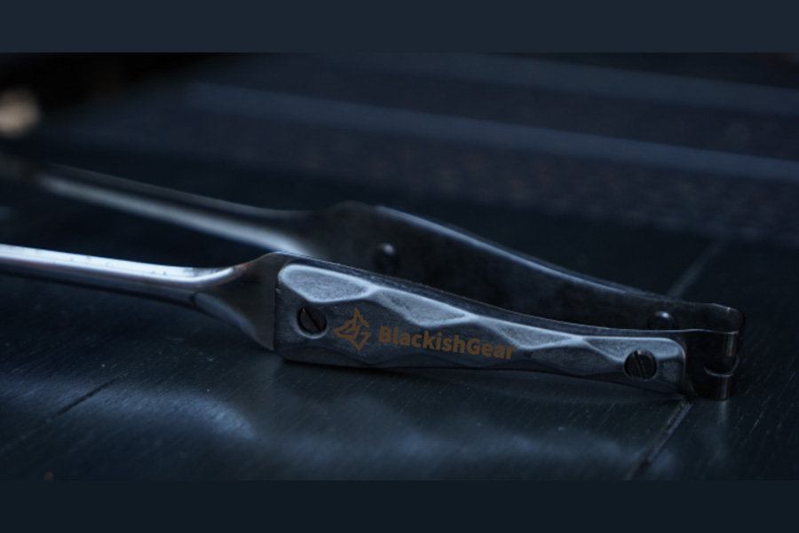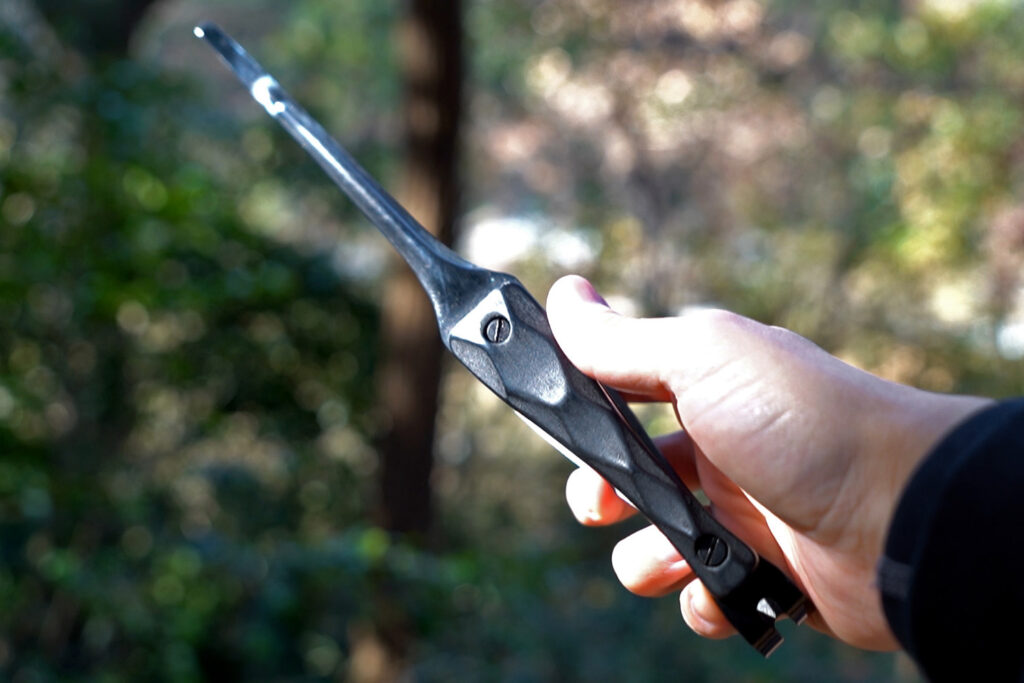 金属部分には、耐熱・耐食性に優れたステンレスを採用。それを独自の技術で黒く染め上げました。通常のステンレス製トングは焚き火の光を白く反射しますが、BLACK EMBER FANGは光を「吸い込み」、艶やかに反射します。ランタンの灯りに照らされた時、そのエッジだけが浮き上がる様子は、他のギアでは味わえない所有欲を満たしてくれます。