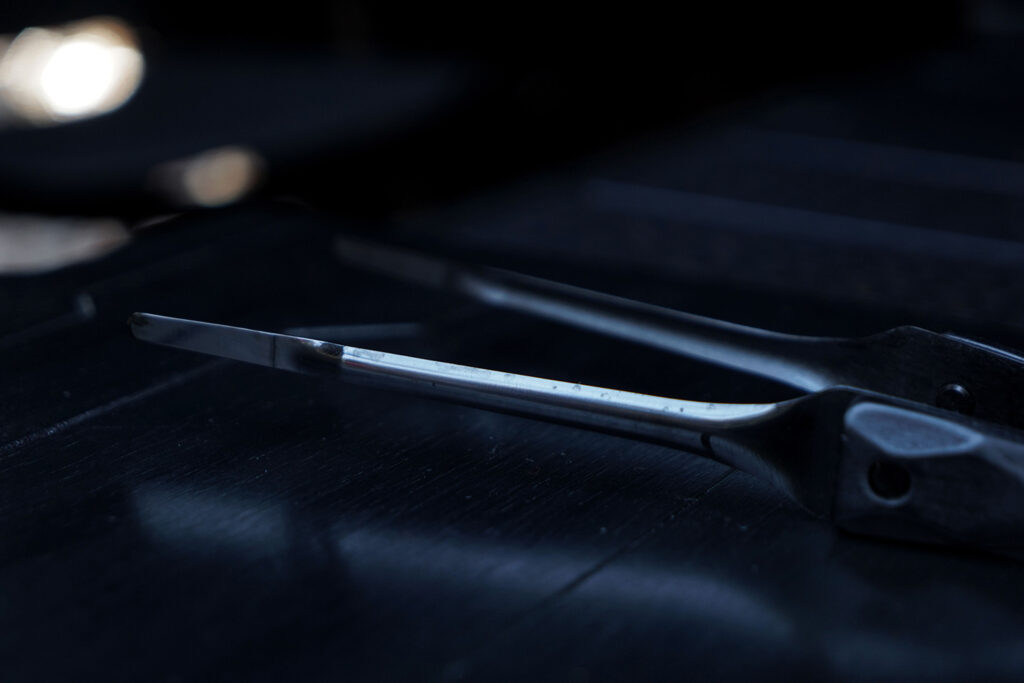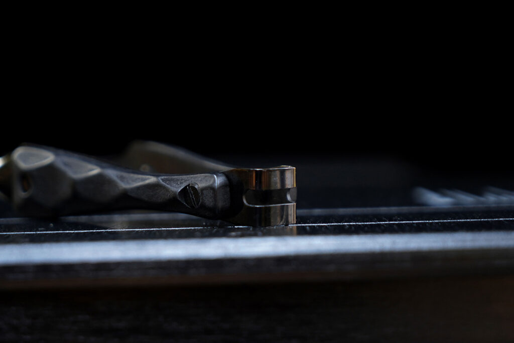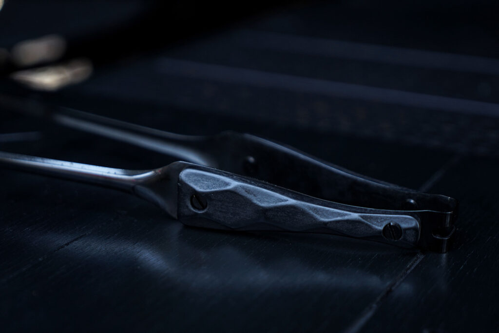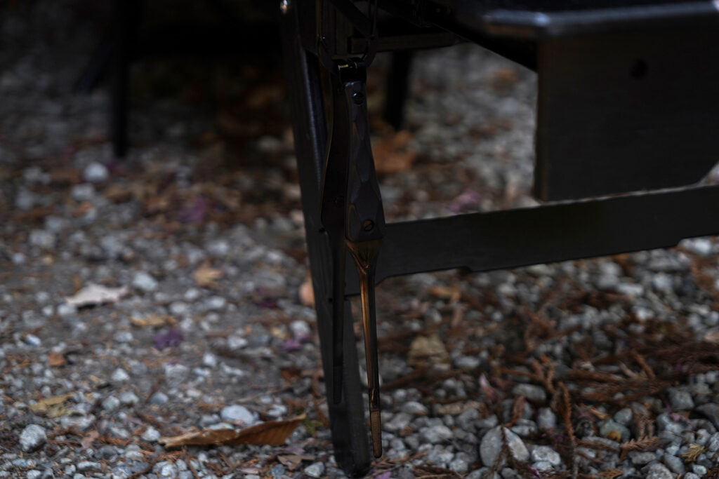 金属部分には、耐熱・耐食性に優れたステンレスを採用。それを独自の技術で黒く染め上げました。通常のステンレス製トングは焚き火の光を白く反射しますが、BLACK EMBER FANGは光を「吸い込み」、艶やかに反射します。ランタンの灯りに照らされた時、そのエッジだけが浮き上がる様子は、他のギアでは味わえない所有欲を満たしてくれます。