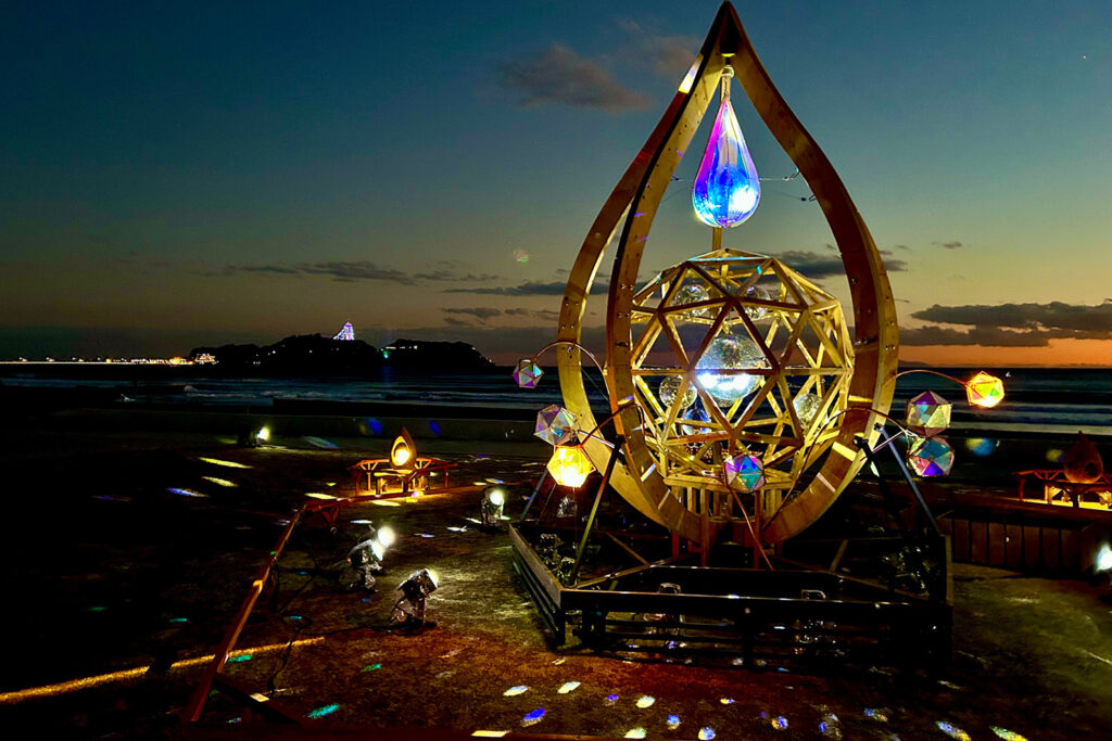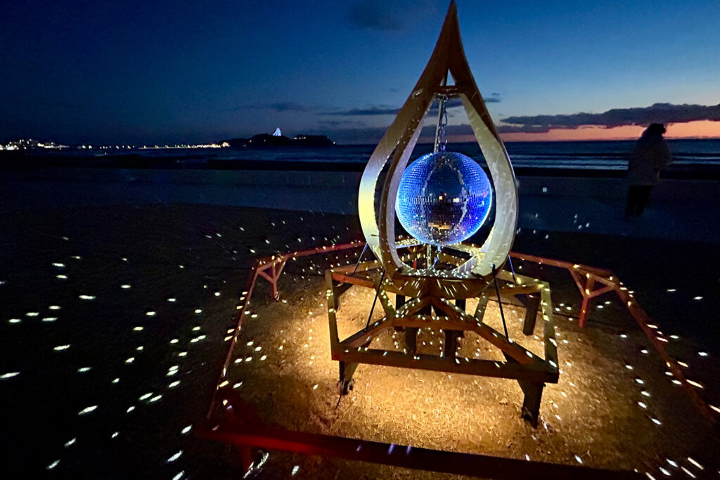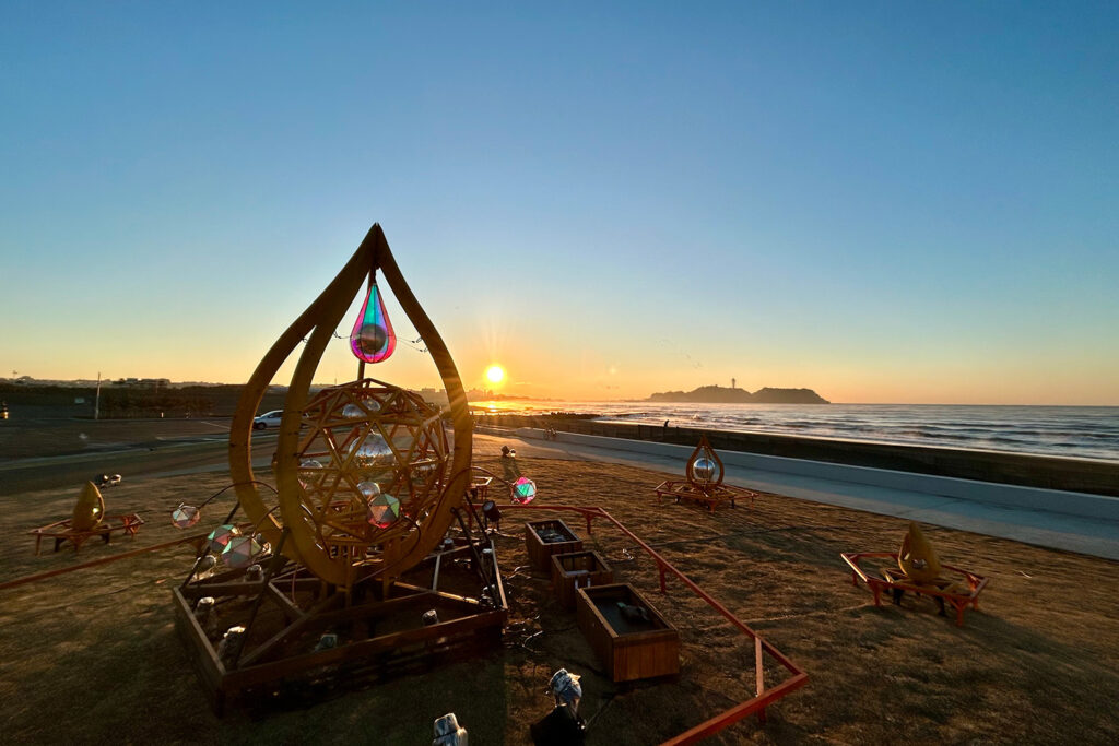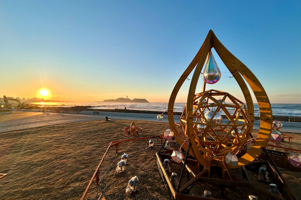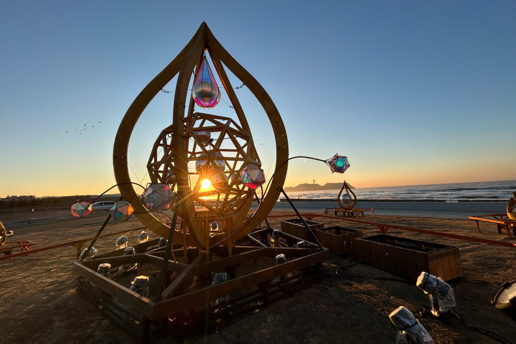 海と空が溶け合う、光の幻想。「Seed of Beginning」と題された鵠沼海浜公園のイルミネーションイベントは、夕陽が沈んだあとのマジックアワーが魅惑的。シルエットが浮かぶ富士山と江の島には17時になるとシーキャンドルに火が点り、種は蒔かれて光を放ち、木製のタネはミラーボールからきらめく雫を解き放っていました。昏れなずむ中で静かな時間が流れます。朝一番も寒いですが、夕刻は寒い北風もあって極寒でした。