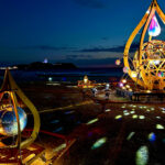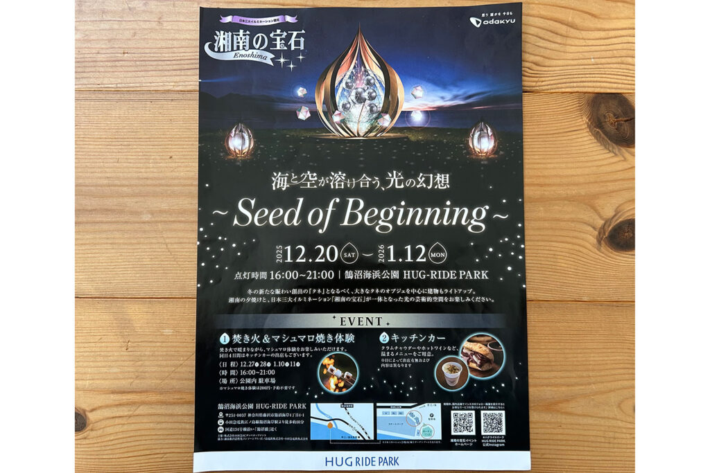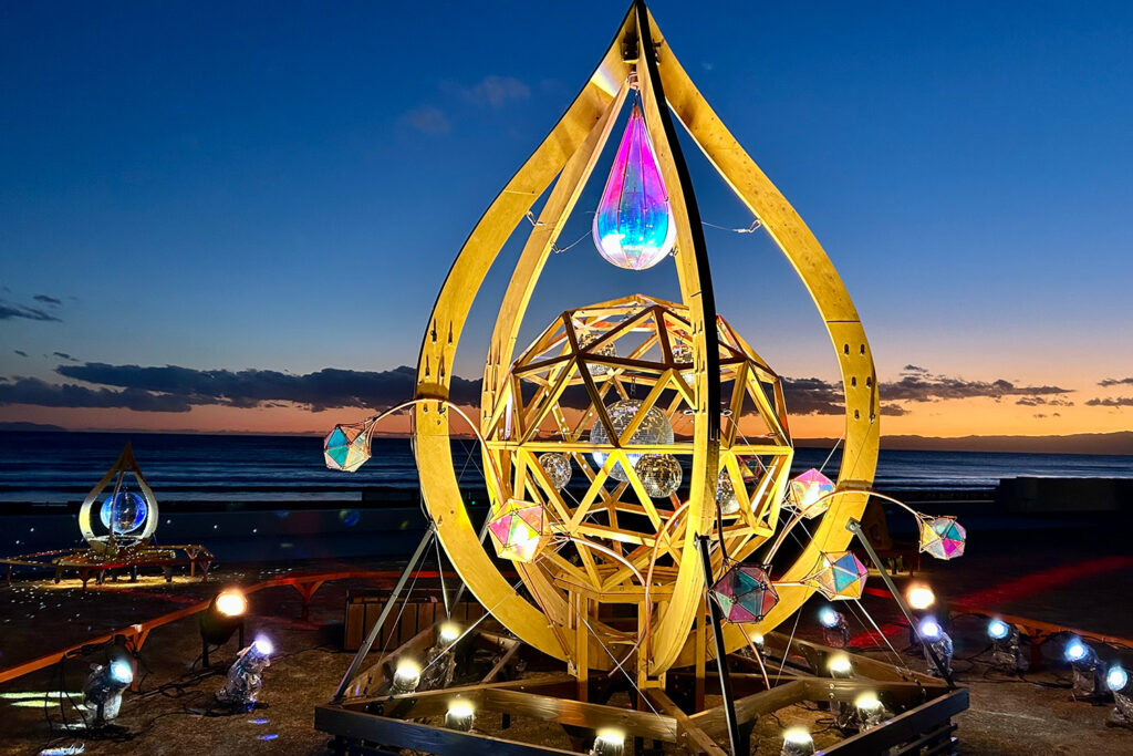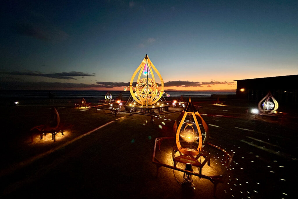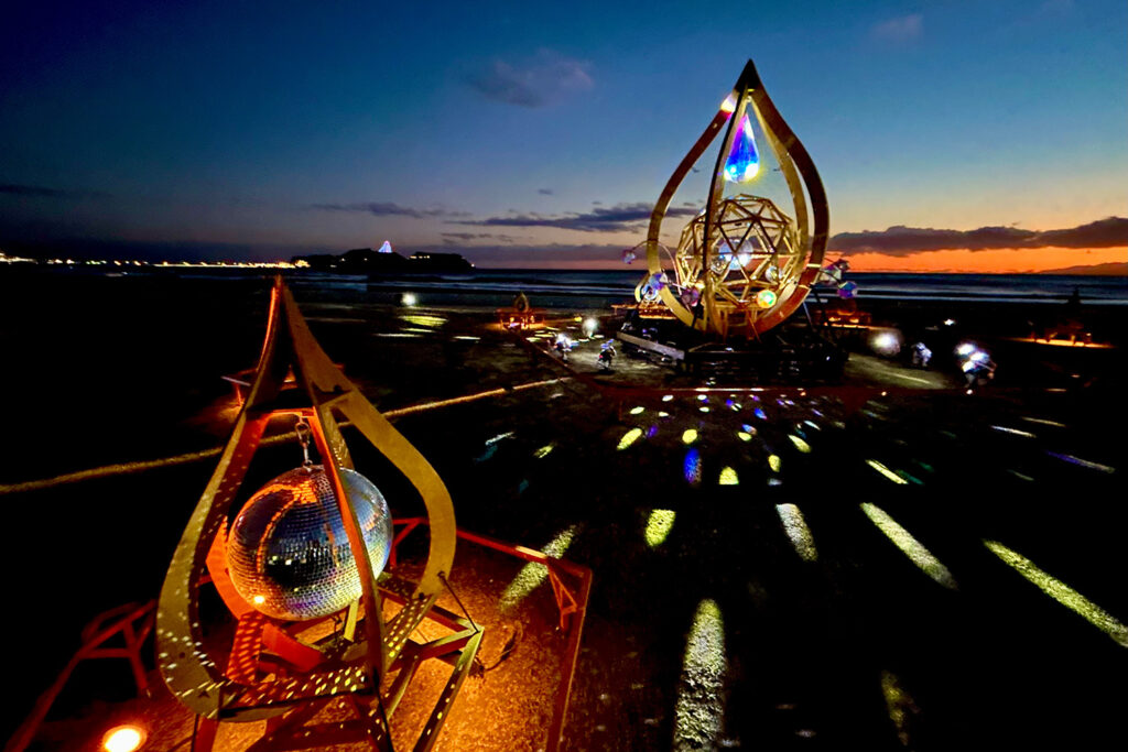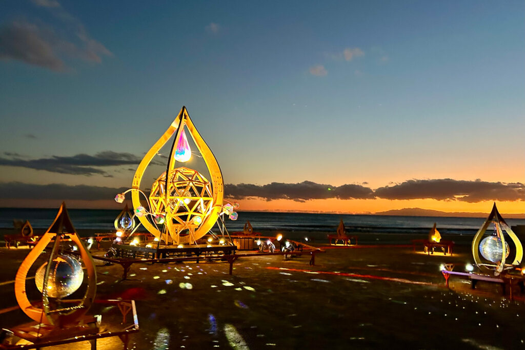 海と空が溶け合う、光の幻想。「Seed of Beginning」と題された鵠沼海浜公園のイルミネーションイベントは、夕陽が沈んだあとのマジックアワーが魅惑的。シルエットが浮かぶ富士山と江の島には17時になるとシーキャンドルに火が点り、種は蒔かれて光を放ち、木製のタネはミラーボールからきらめく雫を解き放っていました。昏れなずむ中で静かな時間が流れます。朝一番も寒いですが、夕刻は寒い北風もあって極寒でした。