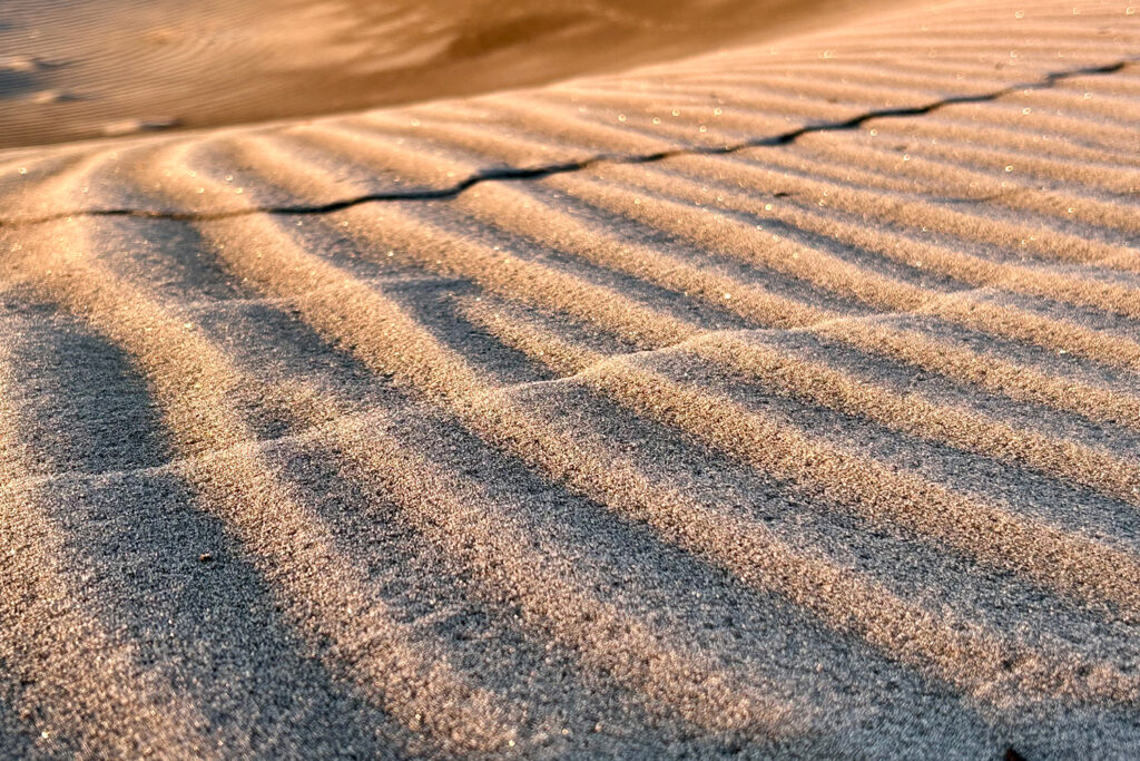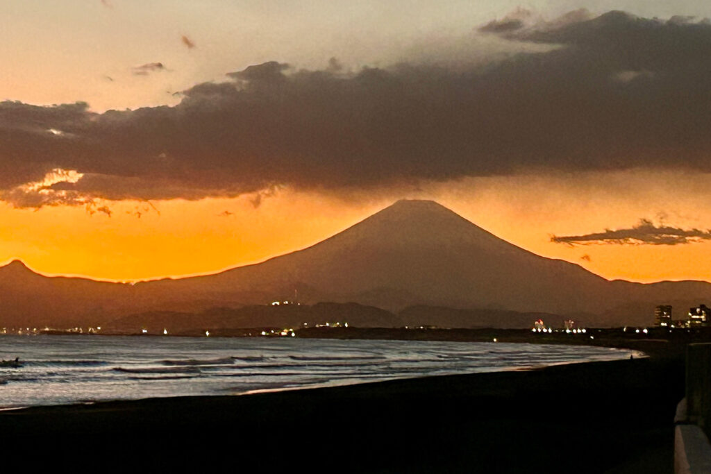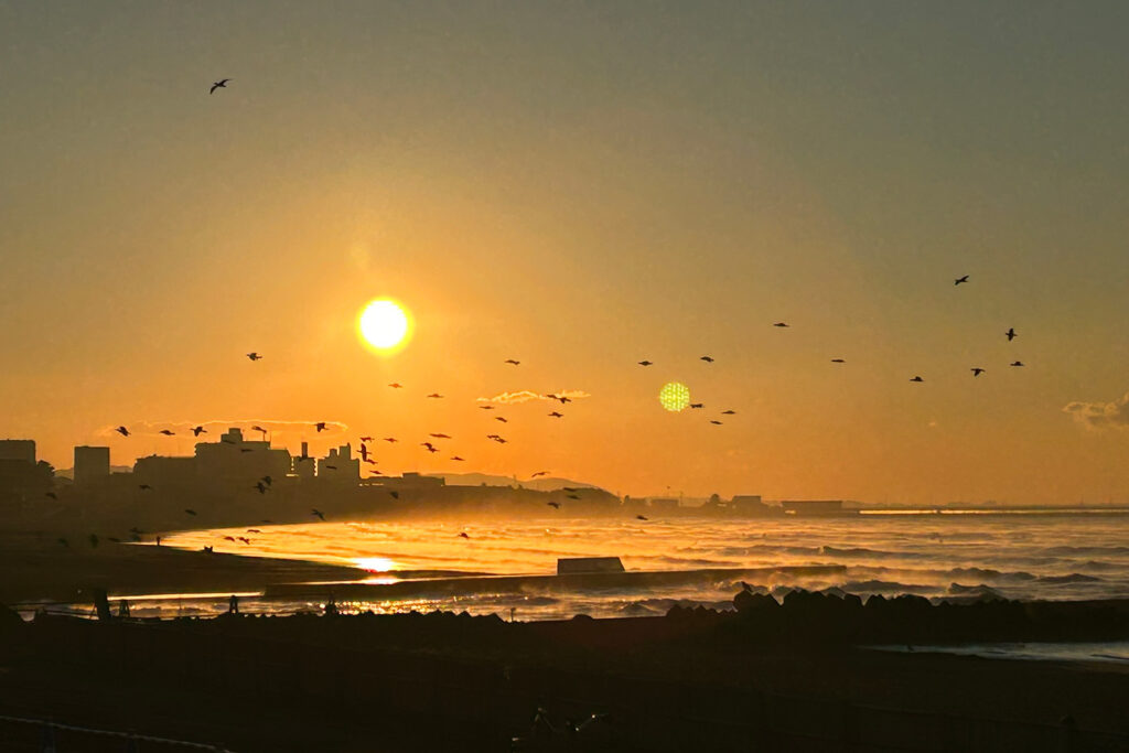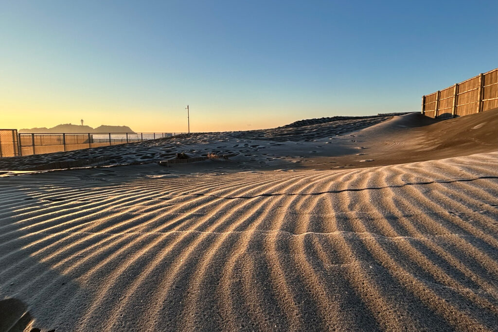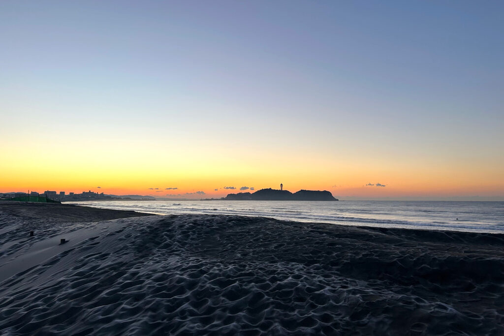 朝焼けに染まる鵠沼海岸は真冬のこの時期、気温が下がると砂浜が白く雪が降り注いだかのように砂紋に白い霜が降りて綺麗です。さらに海水温が暖かく、気温が下がった朝は温泉のように湯気がゆらめき、朝日をより一層綺麗に引き立てて見せてくれます。