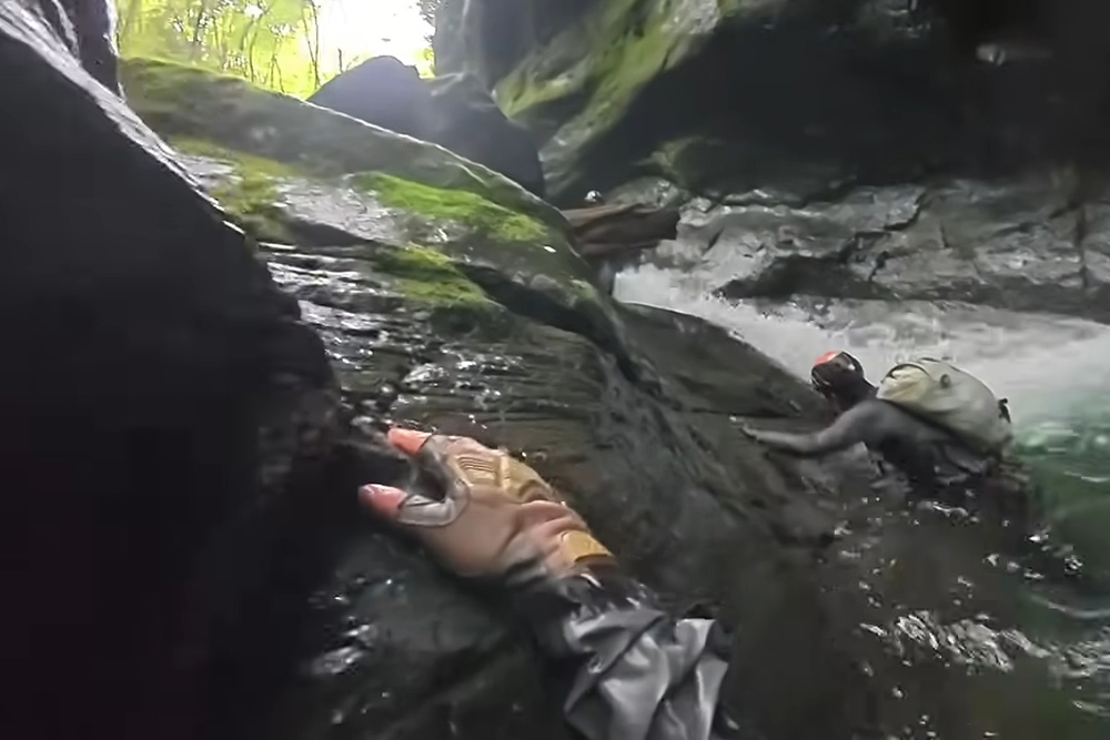 岩が両側にそびえたち薄暗くさえ感じる谷に、いざ突入していきます。この日は増水していたようで、かなりの激流。ゴーッゴーッという水音が響きわたり、岩肌が迫るスリリングなカメラワークに、見ているこちらも思わず足がすくみます。まさに死闘。水流に勝てず、押し戻されてしまうメンバーをロープでヘルプします。
