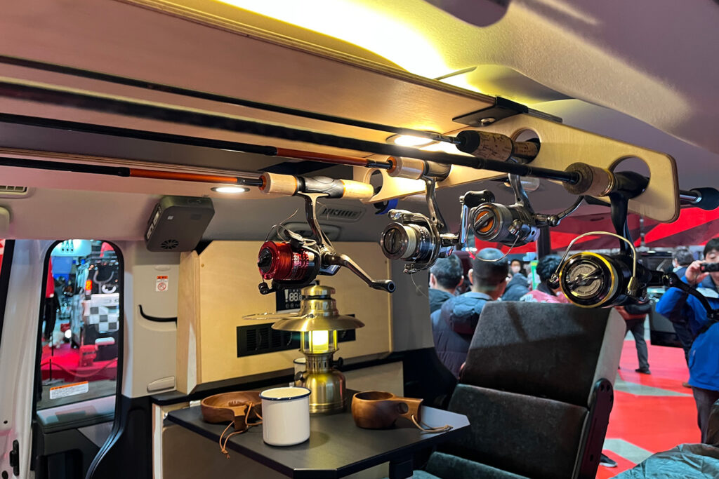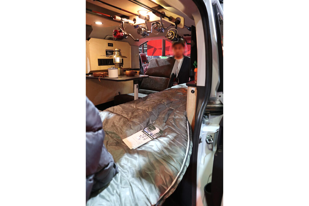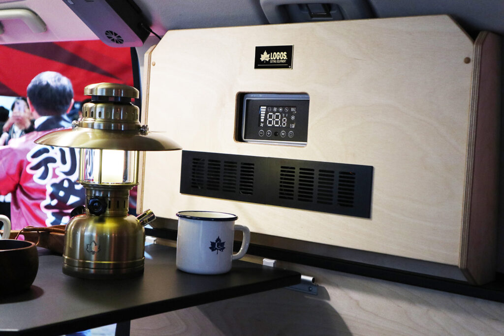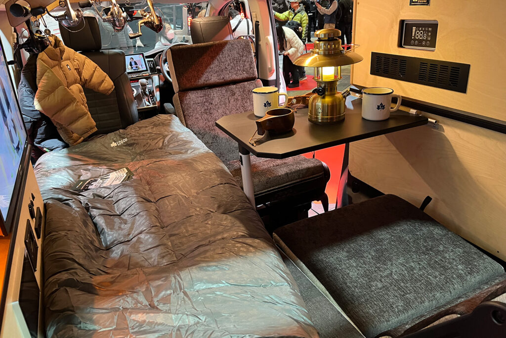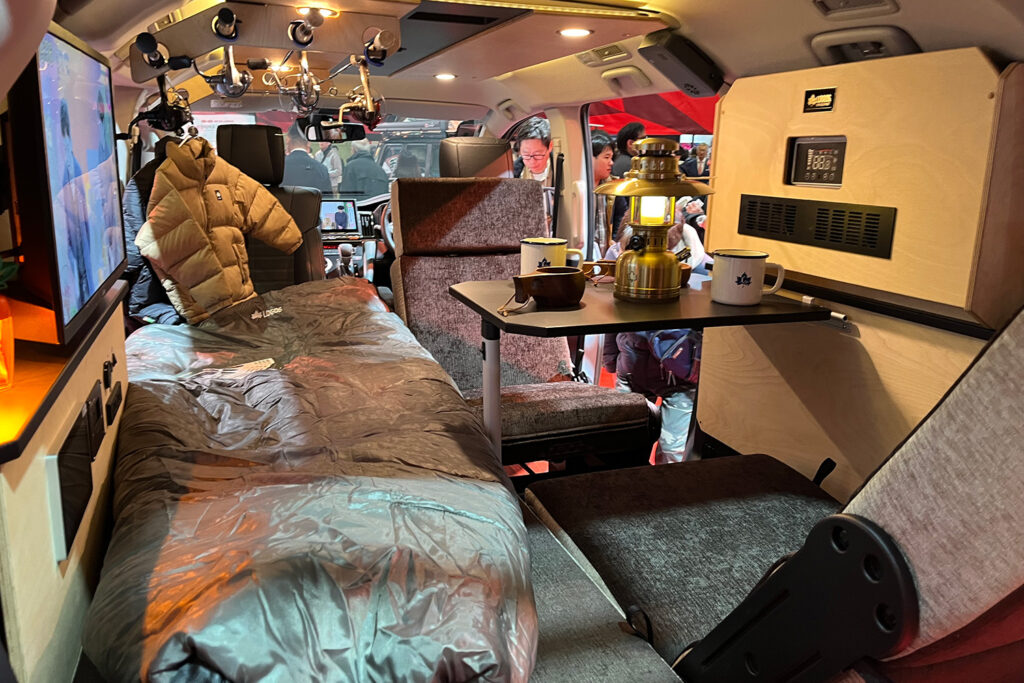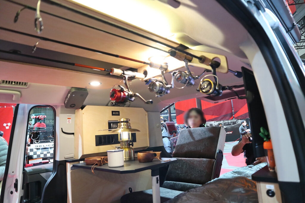 三菱自動車ブースに展示された同モデルは、三重県のキャンピングカービルダーであるダイレクトカーズにより架装され、今回のLOGOS(ロゴス)とのコラボレーションでは、木目を活かした温かみのあるインテリアを実現。