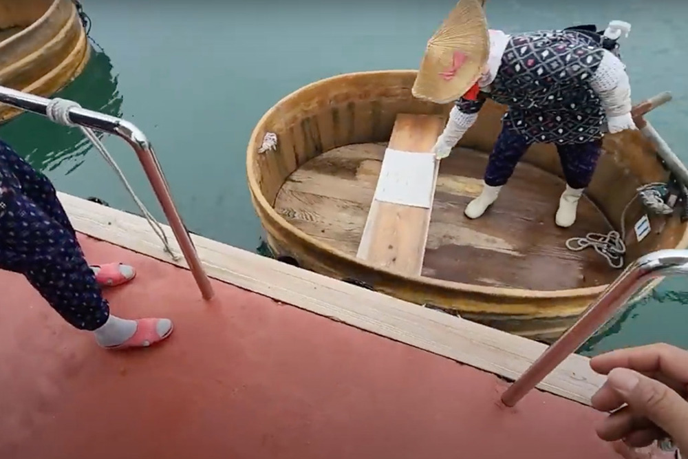 鉄造りの「姫埼灯台」やレトロな街並みを楽しみつつ、島の南東部までくると、たらい舟の乗り場を発見。女性船頭さんが丸いたらい舟を巧みに操る姿は一見の価値ありです。