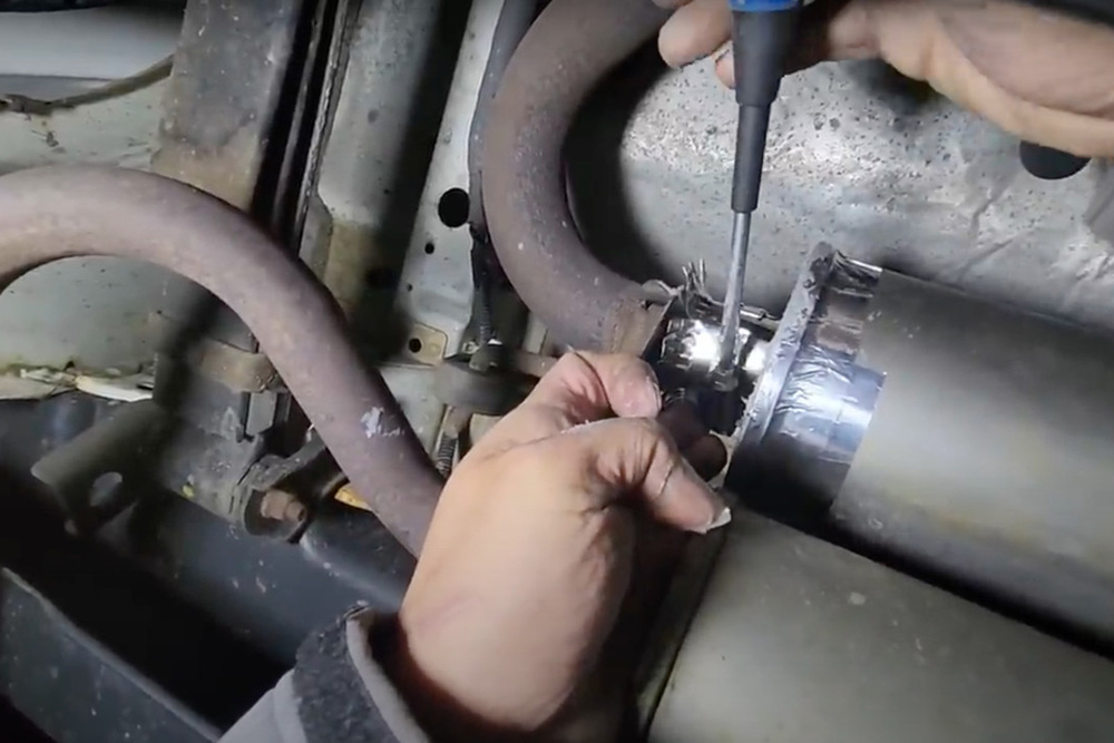 ここで異常な燃費の悪さが気になり、ドライブを中断して車の下を確認してみると、排気ガスの通るマフラー部分に切断箇所が見つかりました。オートバックスとホームセンターで修理パーツを調達したものの、応急処置の専用パテが固まるのに12時間はかかるため、急遽もう1泊することに。キャンプ場に戻ったら、車の下に潜り込んで修理に取り掛かります。