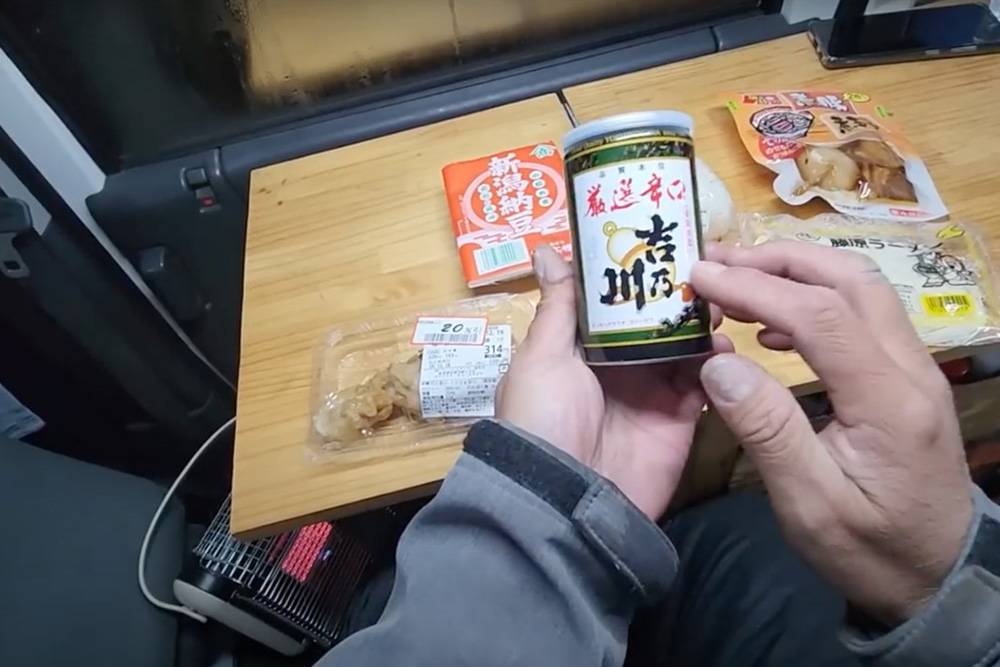 極寒の中での修理が一段落ついたので、お次は楽しい夜ご飯タイム。地元のスーパーでゲットした手作りの唐揚げに、佐渡産のお米を使ったおにぎり、新潟の日本酒「吉野川」を湯煎で温めていただきます。