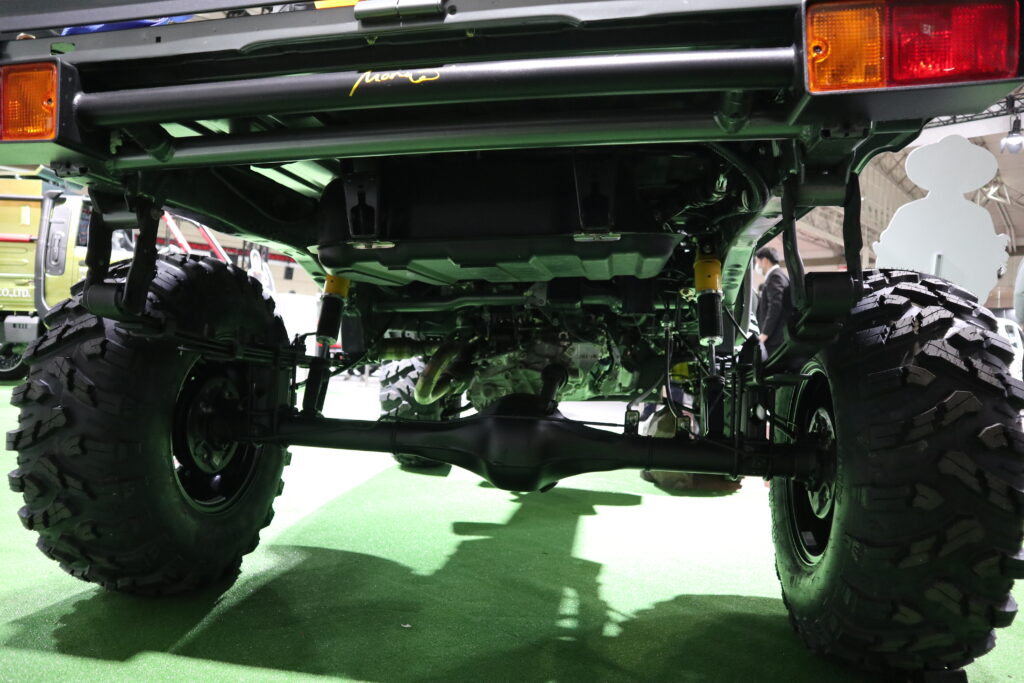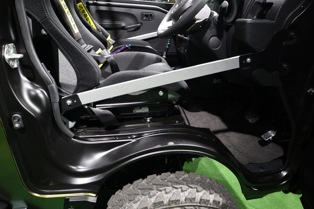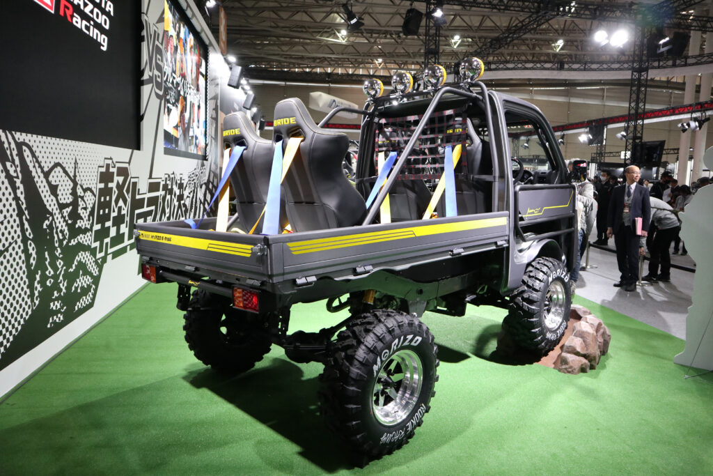 また、ベース車両には軽トラックのキャビンの後ろに余裕のあるハイゼット・ジャンボに、市販車の設定にはないターボエンジンを搭載。駆動方式は4WDで変速機はCVTながら、こちらも設定のない副変速機を装着し、さらにパドルシフトまで備えることで誰でも悪路を走れるうえに走破性の向上を実現している。