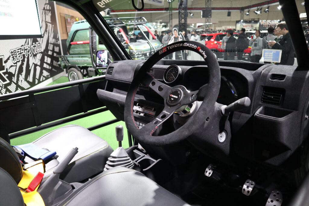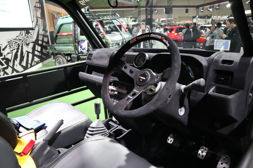 対してトヨタが提案するのがハイゼットを遊び倒すコンセプト。現会長のモリゾウさんからレーシングドライバーとして実績十分の佐々木雅弘氏に無茶ぶりされて開発されたモデルであり、現段階では未完成。しかしトヨタガズーレーシング、ルーキーレーシングの技術を結集しており、見て楽しい、乗って楽しいをコンセプトに開発中。「いわばホビー仕様の軽トラックという訳です」