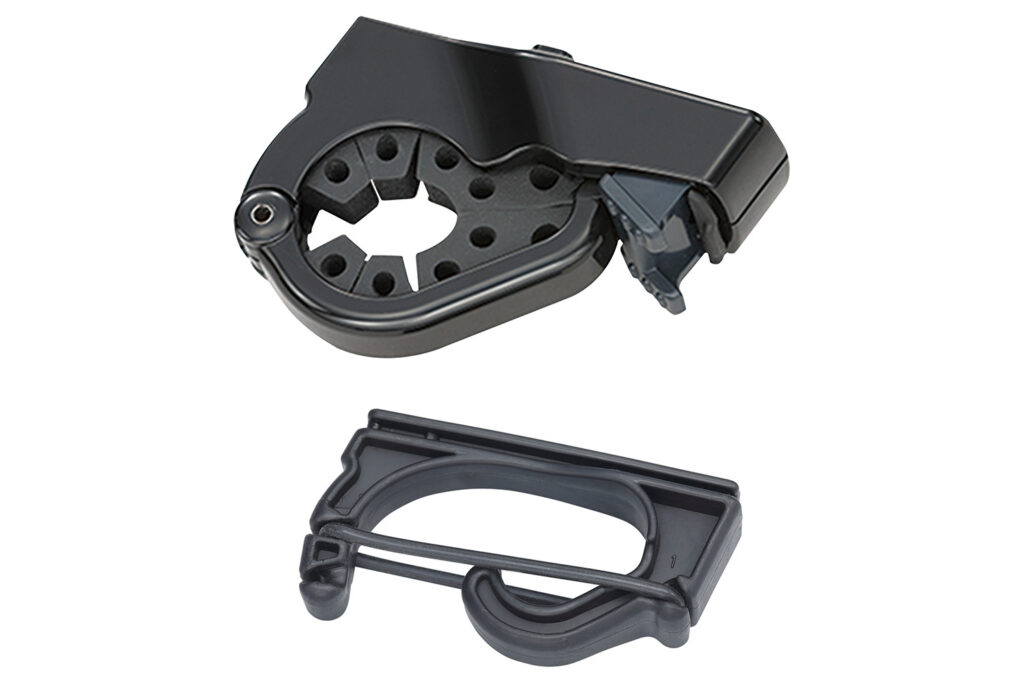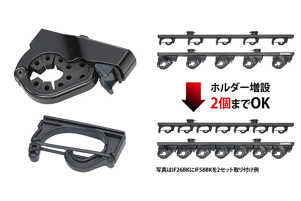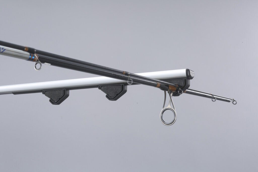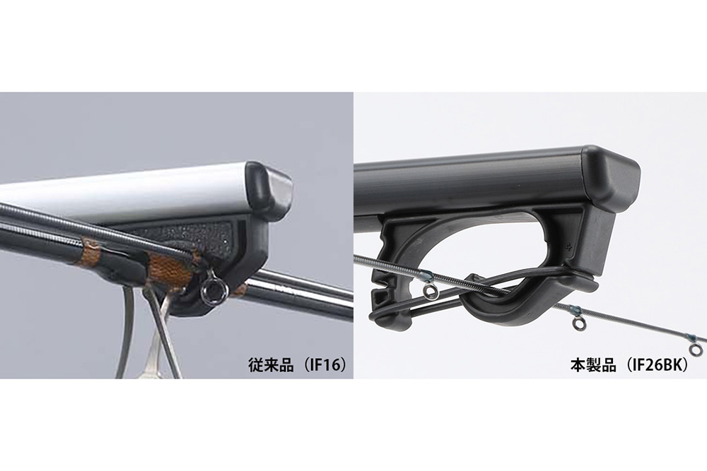 新製品(IF26BK/27BK/28BK)において、機能面で最大級のアップデートが施されたのがフロントホルダーです。従来品で課題となっていた「スポンジの経年劣化」を克服し、強度が高く、長期間の使用でもグリップ力が落ちにくい特殊ゴムを採用。また、極細のティップ(穂先)を持つロッドでも、ゴムバンドの掛ける位置を細かく調整可能。走行中の微振動や異音を徹底的に排除し、繊細なカーボンロッドを優しく、かつ強固に守ります。