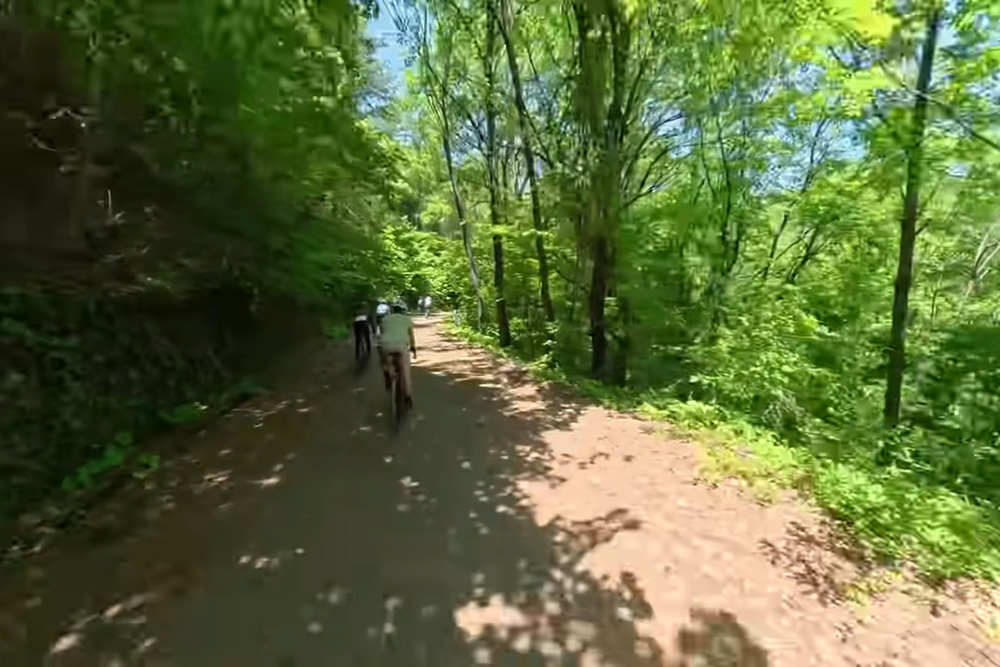 グラベルライドのために集まった大勢のサイクリストたちと、出発地点である「あいぽーと佐渡」を出発。気持ちよい風を感じながら、やわらかい木漏れ日の中を走り抜けていきます。自然あふれる森の中ですが、熊や猪がおらず安全。けんたさんが佐渡でよくキャンプをする理由は、この安全さのため。路面も走りやすく、初心者の方でも安心して走ることができます。