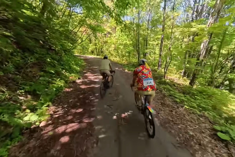 ぬかるんだ路面や木などに注意を払いながら、仲間とともに山道を進みます。昨日の「佐渡ロングライド」ではコースが海沿いでしたが、今日は森の中。「佐渡の魅力は全部っすねー」と会話しながら、森の中で感じる自然を堪能しています。