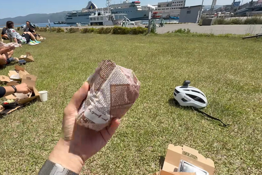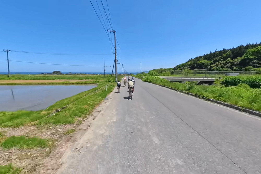 風をきって走り、山から降りてきたサイクリストたち。徐々に車や人、水田、そして昨日のロングライドぶりに海が見えてきます。壮大な風景に、「気持ちいいねー」と繰り返すけんたさんでした。
