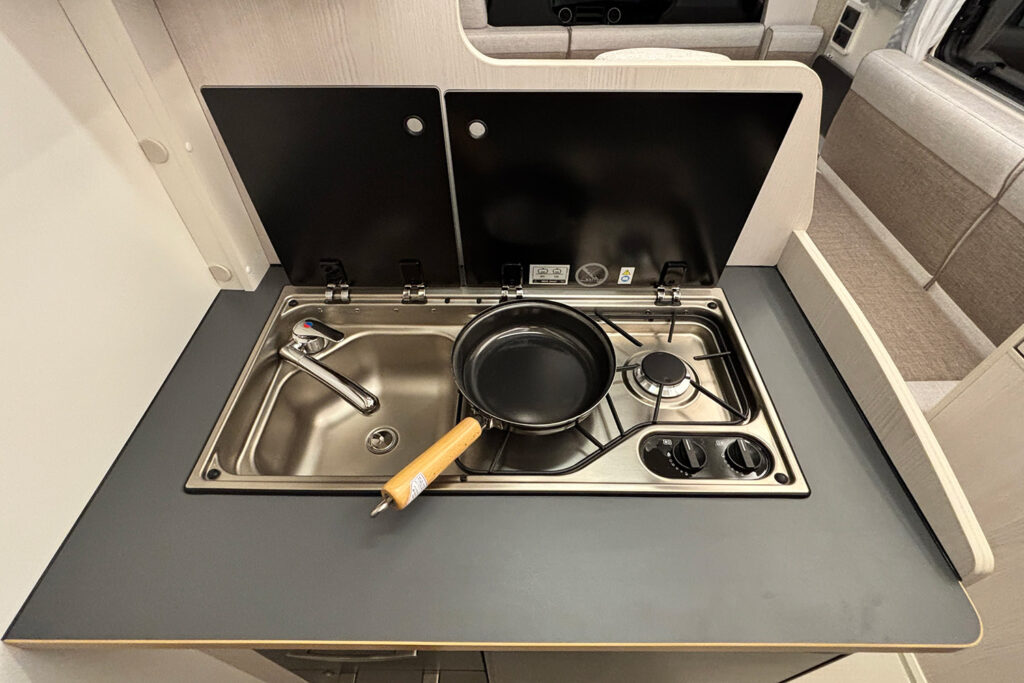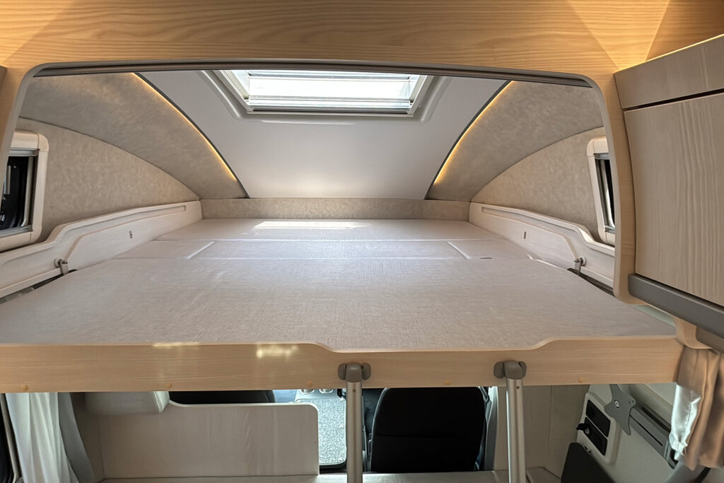 バンクベッドとの一体感も高く、まるで一つの大きな寝室のような安心感を提供します。また、キャブコンの象徴であるバンクベッドは、スライド式を採用。展開時は1940mm×1740mmのサイズを確保し、大人2名が余裕を持って就寝でき、読書灯やコンセント、間仕切りカーテンを備え、プライベートな休息時間を約束します。