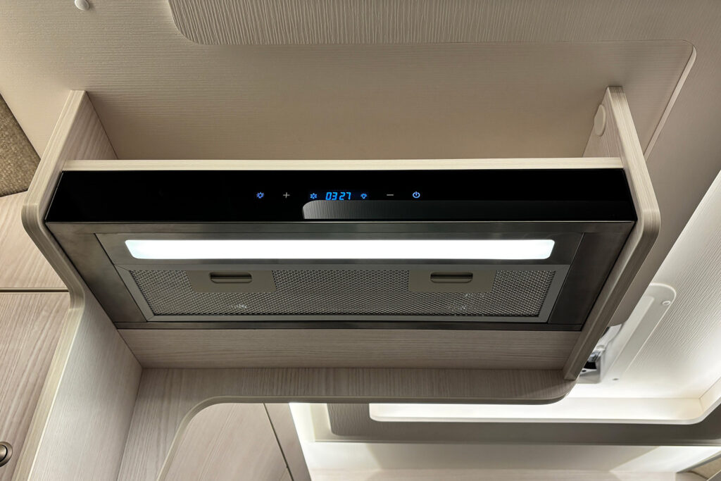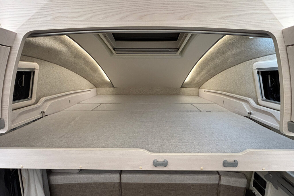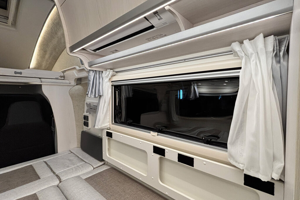 バンクベッドとの一体感も高く、まるで一つの大きな寝室のような安心感を提供します。また、キャブコンの象徴であるバンクベッドは、スライド式を採用。展開時は1940mm×1740mmのサイズを確保し、大人2名が余裕を持って就寝でき、読書灯やコンセント、間仕切りカーテンを備え、プライベートな休息時間を約束します。