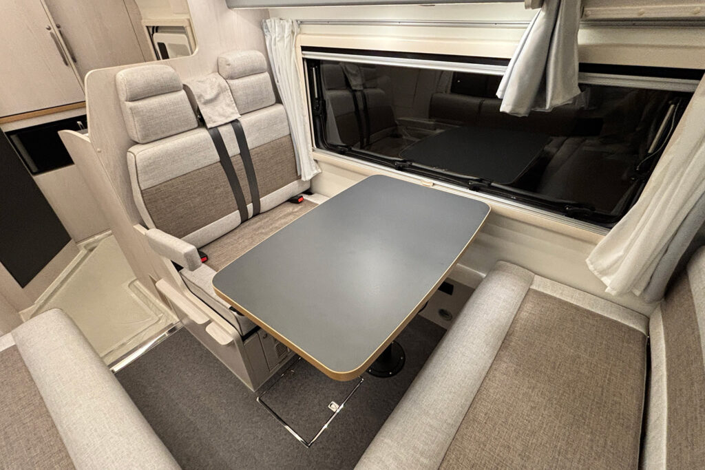 テーブルを三方向から囲む「コの字型」のレイアウトは、ファミリーやグループが自然に視線を合わせられる温かな空間を演出。 「移動中も、停泊中も、家族が常に一つの輪になれる」。そんな設計思想が、このダイネットには息づいています。