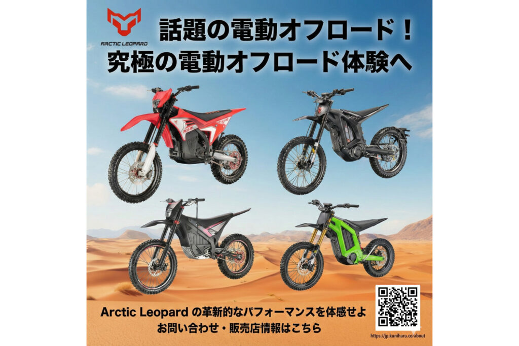 この興奮冷めやらぬなか、電動モビリティの輸入販売を手掛けるクニハル株式会社(本社:埼玉県、代表取締役:日進 吉)は、ダカール・ラリーやEMX世界選手権で培われた最先端技術を惜しみなく投入した「Arctic Leopard」の主力モデル『XE Pro S』の日本国内向け公道走行モデルを発売。これまでオフロード競技の世界でしか味わえなかった「瞬発的な加速」と「驚異的な軽さ」が、日本のナンバープレートを付けて公道を駆け抜けます。
