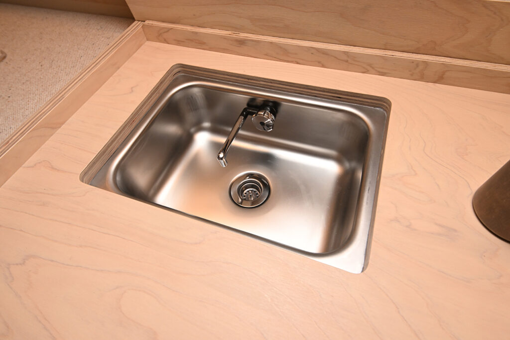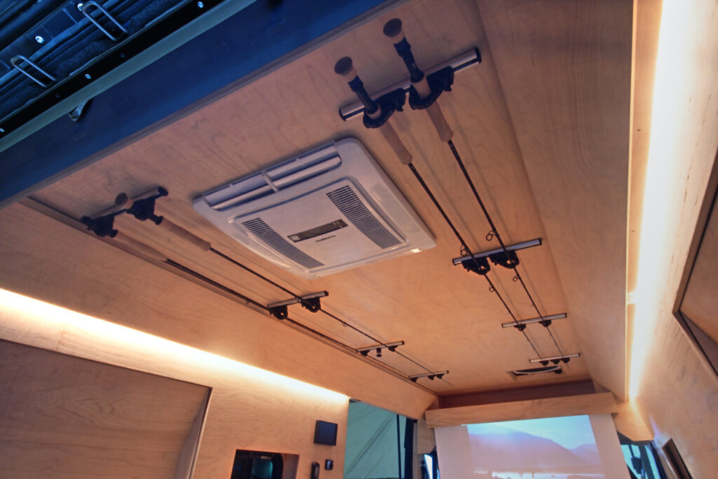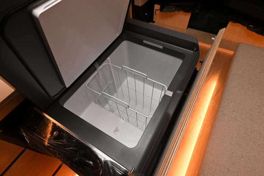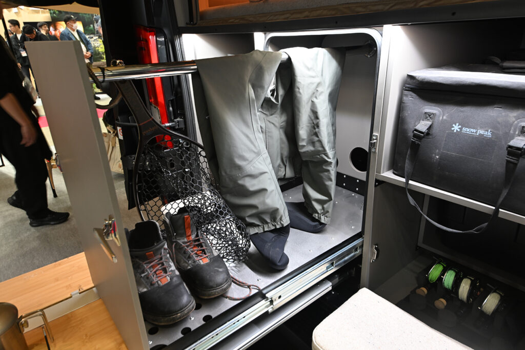 居住スペースには角型シンク、電子レンジ、冷蔵庫を完備。天井部にはロッドホルダーを備えるいっぽう、車両後方はトイレ等の装備をあえて省き、外部から直接アクセスできる広大な収納スペースとしています。さらにFFヒーターを活用したドライルームや床下収納式のロッドホルダーも用意。