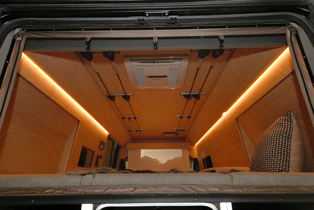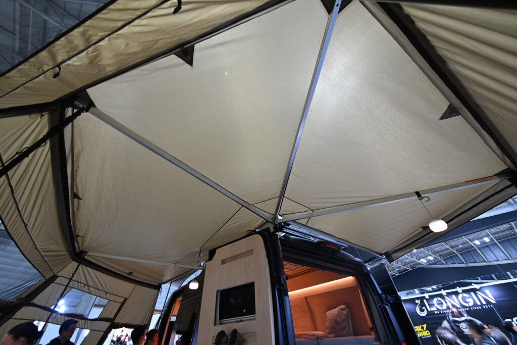 ルーフにはエアコンに加え、衛星通信「スターリンク」のアンテナも装備。270度展開するオーニングを広げれば、車両周囲までを快適なリビングとして活用できます。「車内で完備」というよりは天候に左右されずに外遊びを最大化させる、実践的な仕様という印象を受けました。
