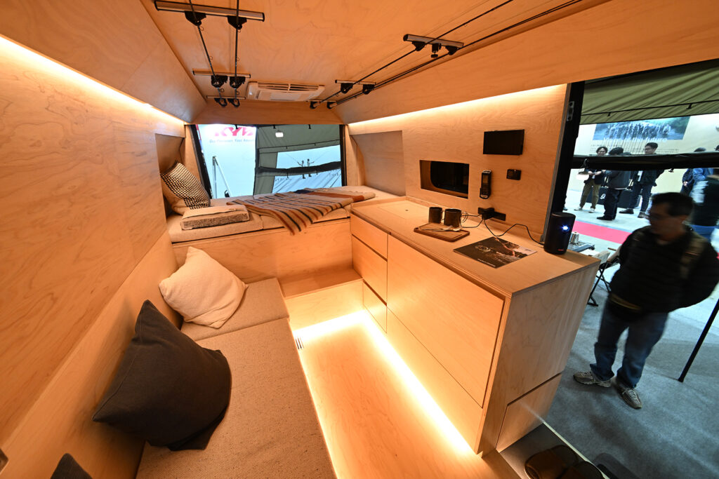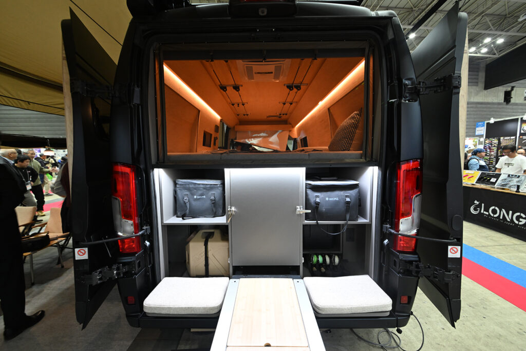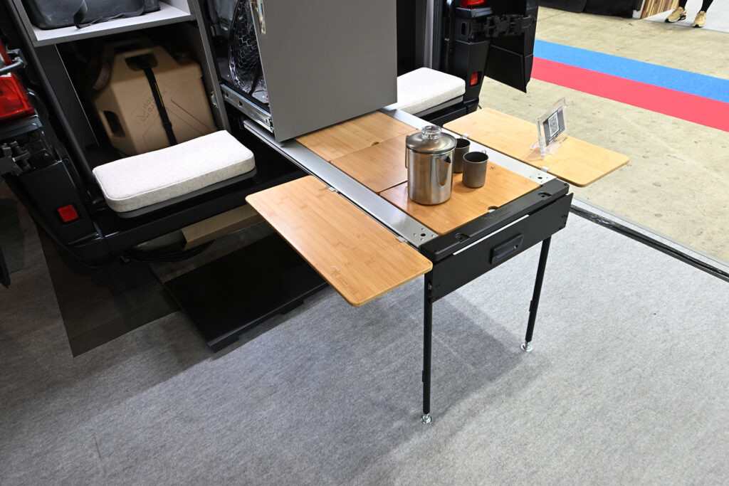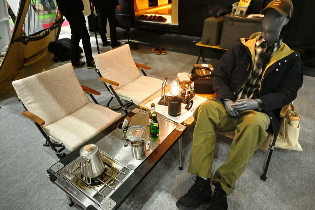 本車両は人気アウトドアブランド「Snow Peak(スノーピーク)」とのコラボレーションにより誕生しました。出展ブースも同ブランドの隣に位置し、車内はもちろん車両周辺にもスノーピーク製品を配置。アウトドアでの具体的な使用シーンを想起させる演出がなされています。