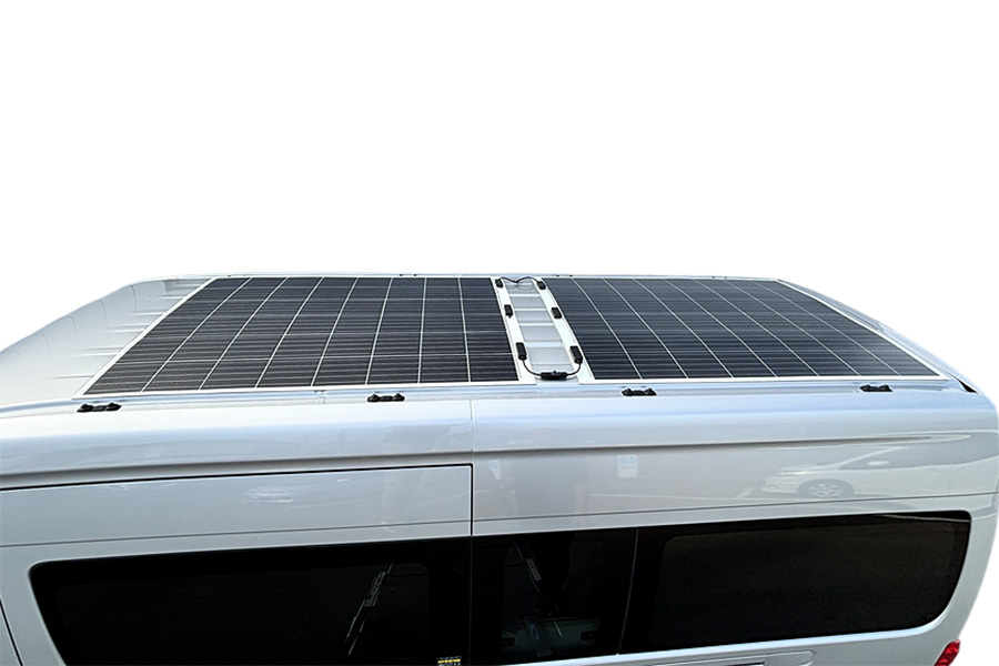 クーラーパッケージプラス2を選択すると、リチウムイオンバッテリー500Ah、インバーター3000W、12Vクーラー専用外部電源口、ポータブルバッテリー電源口、外部電源装置(50Aチャージャー)、100Vコンセント、そして、断熱加工がセットで搭載されます。また、オプションで薄型ソーラーパネル250Wを最大2枚追加することも可能です。