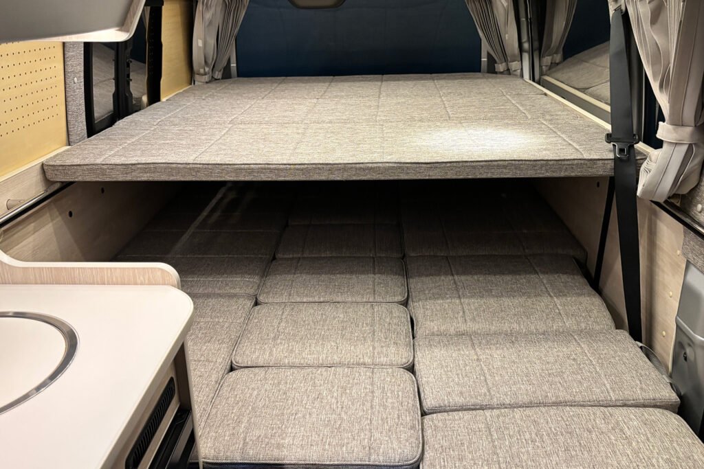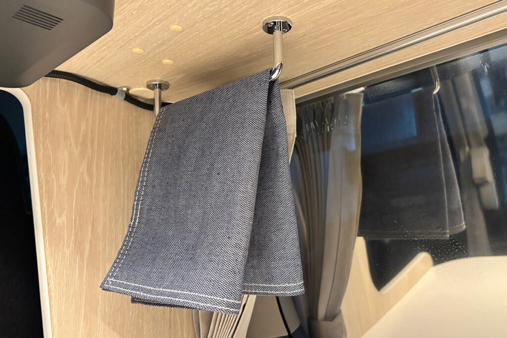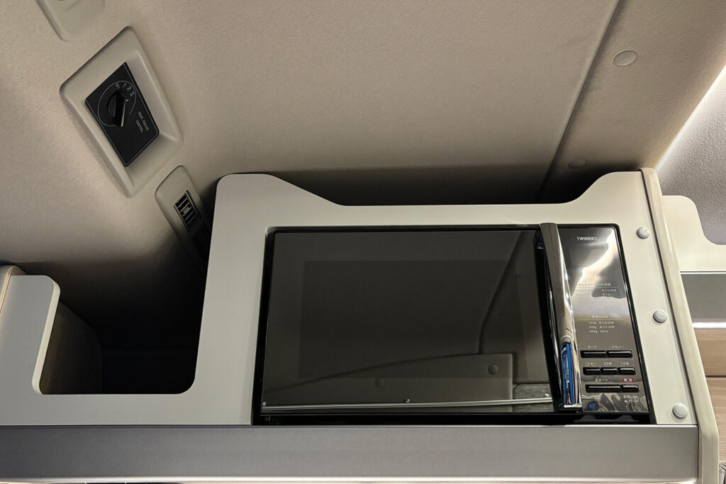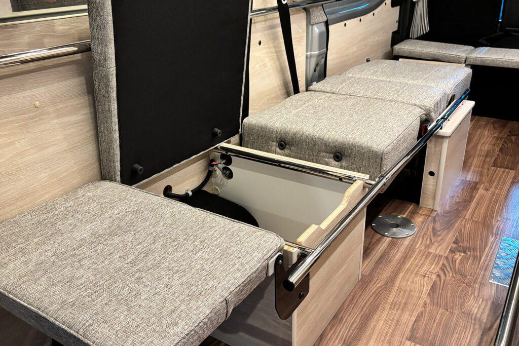 横向きシート(3人掛け)の上部には、衣類や小物をたっぷり収納できる収納棚を設置。開け閉めもしやすく、取り出しやすい機構になっています。また、スキー板やフィッシングロッドなどの長尺荷物もスムーズに収納できるスペースも確保しました。サードシート座面の下には簡易トイレが収納可能。小さなお子様の急なトイレの際にスムーズに対応できます。