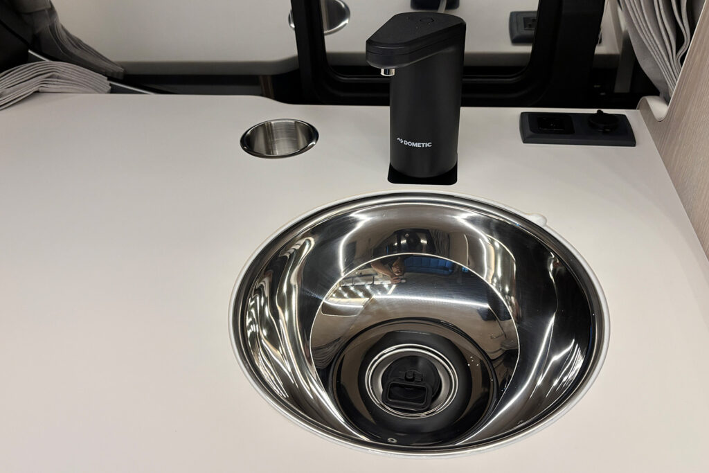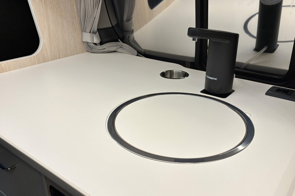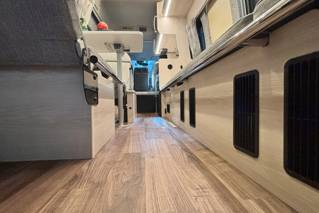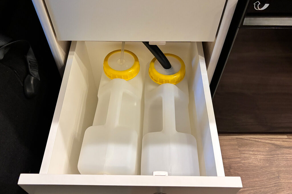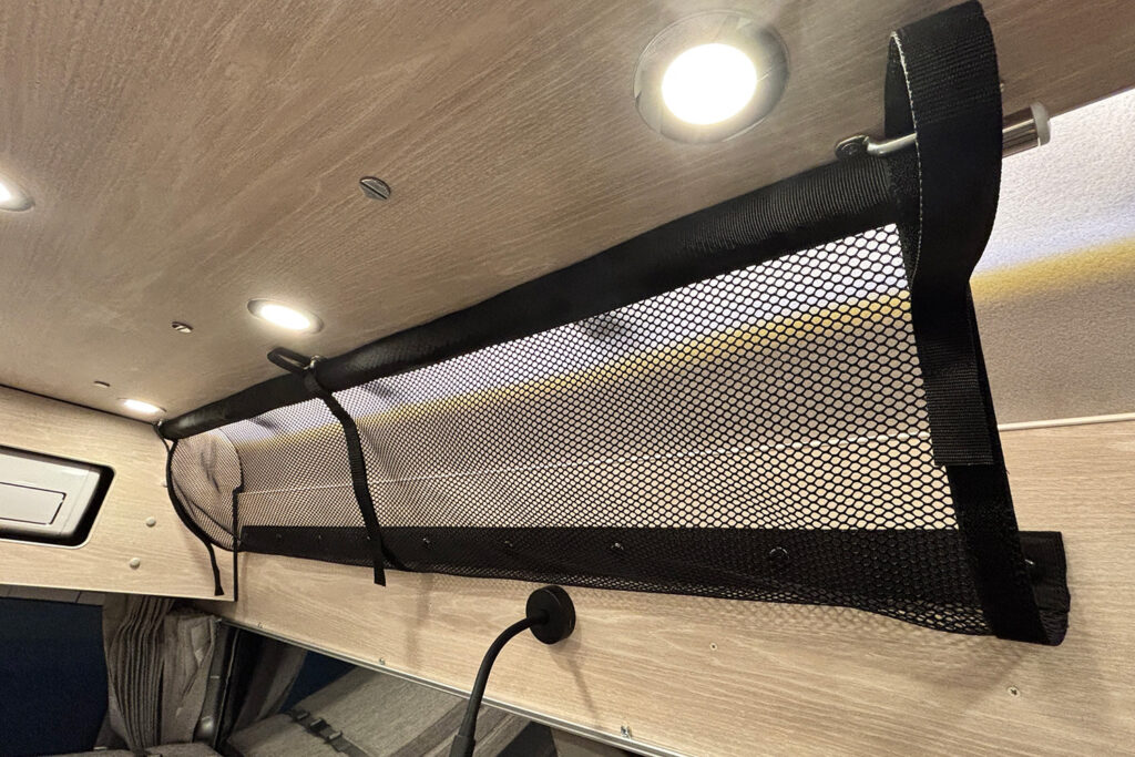 横向きシート(3人掛け)の上部には、衣類や小物をたっぷり収納できる収納棚を設置。開け閉めもしやすく、取り出しやすい機構になっています。また、スキー板やフィッシングロッドなどの長尺荷物もスムーズに収納できるスペースも確保しました。サードシート座面の下には簡易トイレが収納可能。小さなお子様の急なトイレの際にスムーズに対応できます。