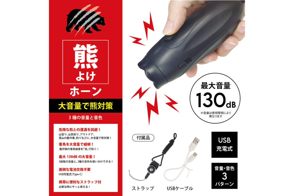 鈴の音だけでは不安な場面や、悪天候下での対策として登場したのが、充電式の「熊よけホーン」です。落雷レベルの「130dB」の音量は、ジェット機のエンジン付近や落雷に匹敵する、耳をつんざくような大音量です。風が強く鈴の音が流されてしまう日や、見通しの悪いカーブの先に対して事前に警告を発したい時に最適です。