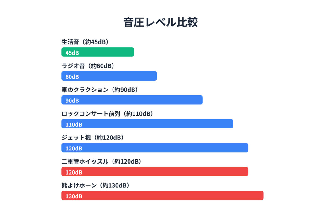 130dBという音量は、ジェット機のエンジン付近や落雷に匹敵する、耳をつんざくような大音量です。風が強く鈴の音が流されてしまう日や、見通しの悪いカーブの先に対して事前に警告を発したい時に最適です。