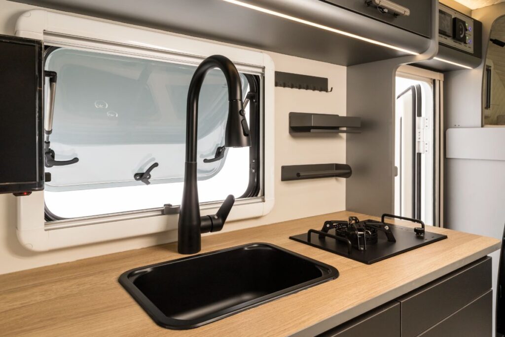 PLATの車内には、ミニマリストも唸る機能美が凝縮されています。マグネット式キッチンウォールは、調理器具や棚を自分の使いやすい位置に自由にレイアウトが可能。引き出し式テーブルは、必要な時だけ現れるワークスペース。旅先でのリモートワークや優雅なディナーをサポートします。