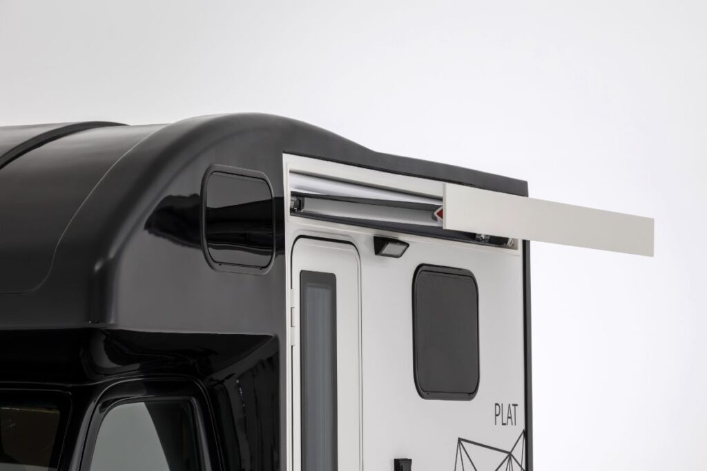 「PLAT」を一目見て驚くのは、これまでのキャンピングカーのイメージを覆す都会的でスタイリッシュな外観です。「Designed Geometry」が描くラインアートは、PLATの外装コンセプトである「Designed Geometry」。