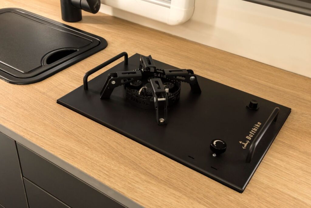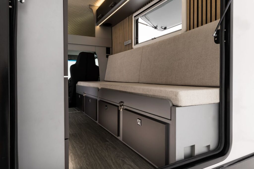 PLATの車内には、ミニマリストも唸る機能美が凝縮されています。マグネット式キッチンウォールは、調理器具や棚を自分の使いやすい位置に自由にレイアウトが可能。引き出し式テーブルは、必要な時だけ現れるワークスペース。旅先でのリモートワークや優雅なディナーをサポートします。