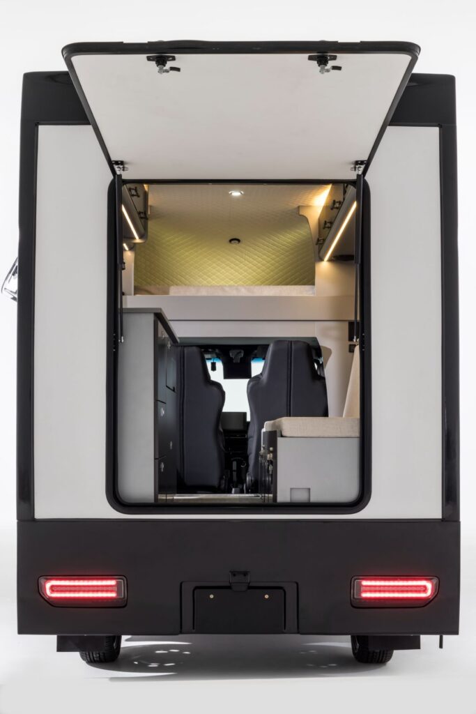 従来のキャンピングカーにありがちな野暮ったいステッカー装飾を排し、幾何学模様のラインアートを大胆に採用。ブラックのボディにホワイトのシェルが映えるコントラストは、深い森のキャンプサイトはもちろん、高層ビルが並ぶ都市のパーキングでも異彩を放つデザインです。