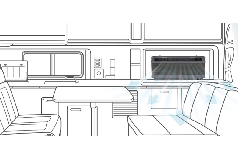 キャンピングカーでの長旅を想定し、衛生面への配慮も万全です。自動内部乾燥機能により、運転停止後、室内機内部を送風乾燥。カビや不快なニオイの発生を元から絶ちます。また、簡単フィルタ掃除の機能では、フィルタを真下に引くだけで取り外せる設計を採用。工具不要でいつでも手軽にお手入れすることが可能です。