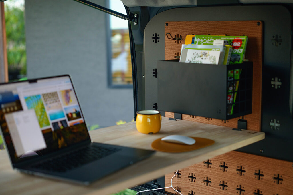 「tac・luc」の佇まいは、シンプルでタフなスカンジナビアン・インダストリアル。 キズに強いサテンブラック塗装のスチールと、オイル仕上げの天然木突板。この異素材の組み合わせは、商用車の無骨な荷室を、まるで北欧のカフェやアトリエのような「心地よい居住空間」へと一変させます。