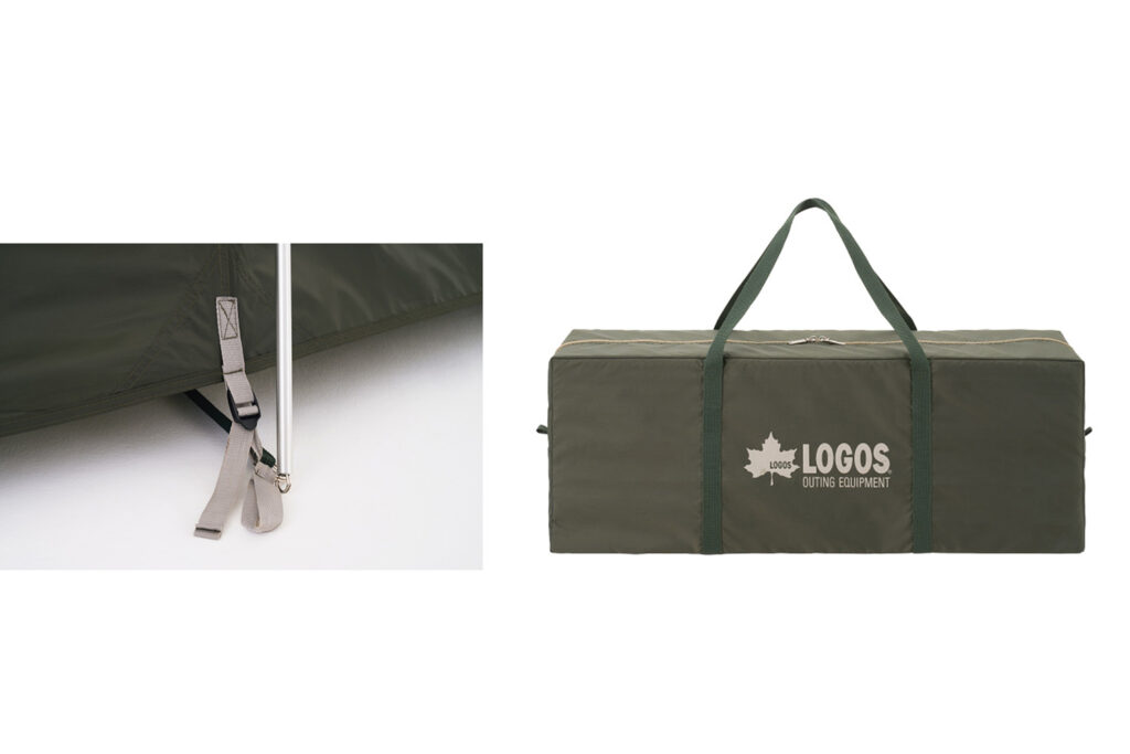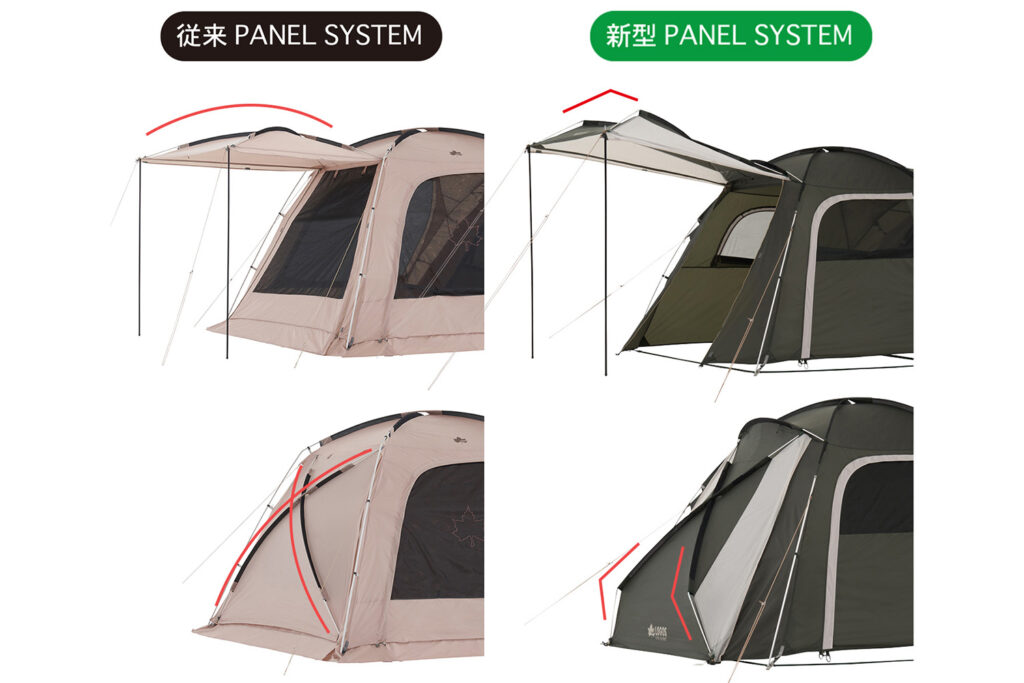 ロゴス独自の「PANEL SYSTEM」は、テントのキャノピー(前室の跳ね上げ部分)にフレームを組み込むことで、強度と居住性を高める画期的な構造を採用。今回の新型モデルでは、その形状がさらなる進化を遂げ、天井の「高さ」を拡張する新構造の新型のパネルシステムにより、クロス状に組み込んだフレームの先端に「絶妙な角度」を加えたことが最大の特徴です。