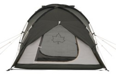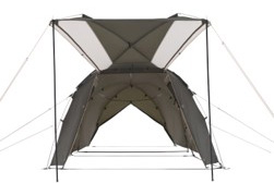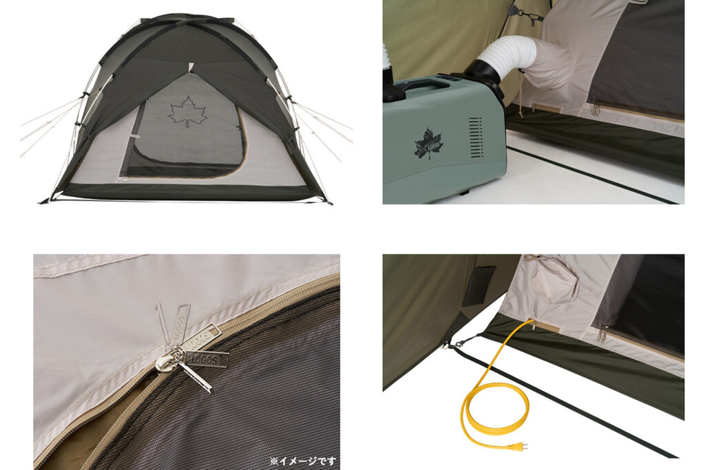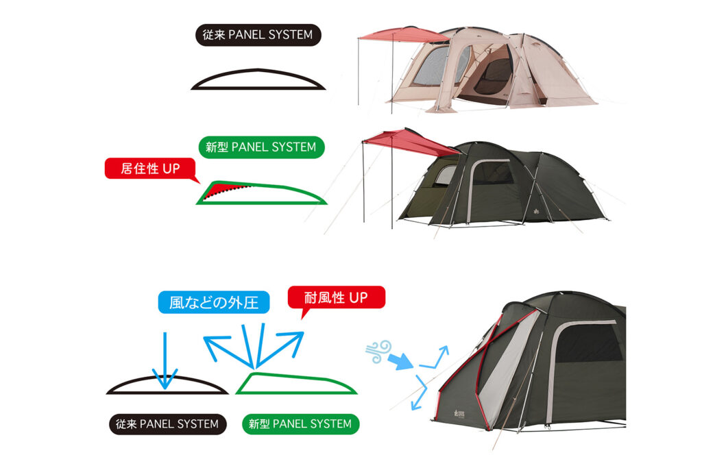 ロゴス独自の「PANEL SYSTEM」は、テントのキャノピー(前室の跳ね上げ部分)にフレームを組み込むことで、強度と居住性を高める画期的な構造を採用。今回の新型モデルでは、その形状がさらなる進化を遂げ、天井の「高さ」を拡張する新構造の新型のパネルシステムにより、クロス状に組み込んだフレームの先端に「絶妙な角度」を加えたことが最大の特徴です。